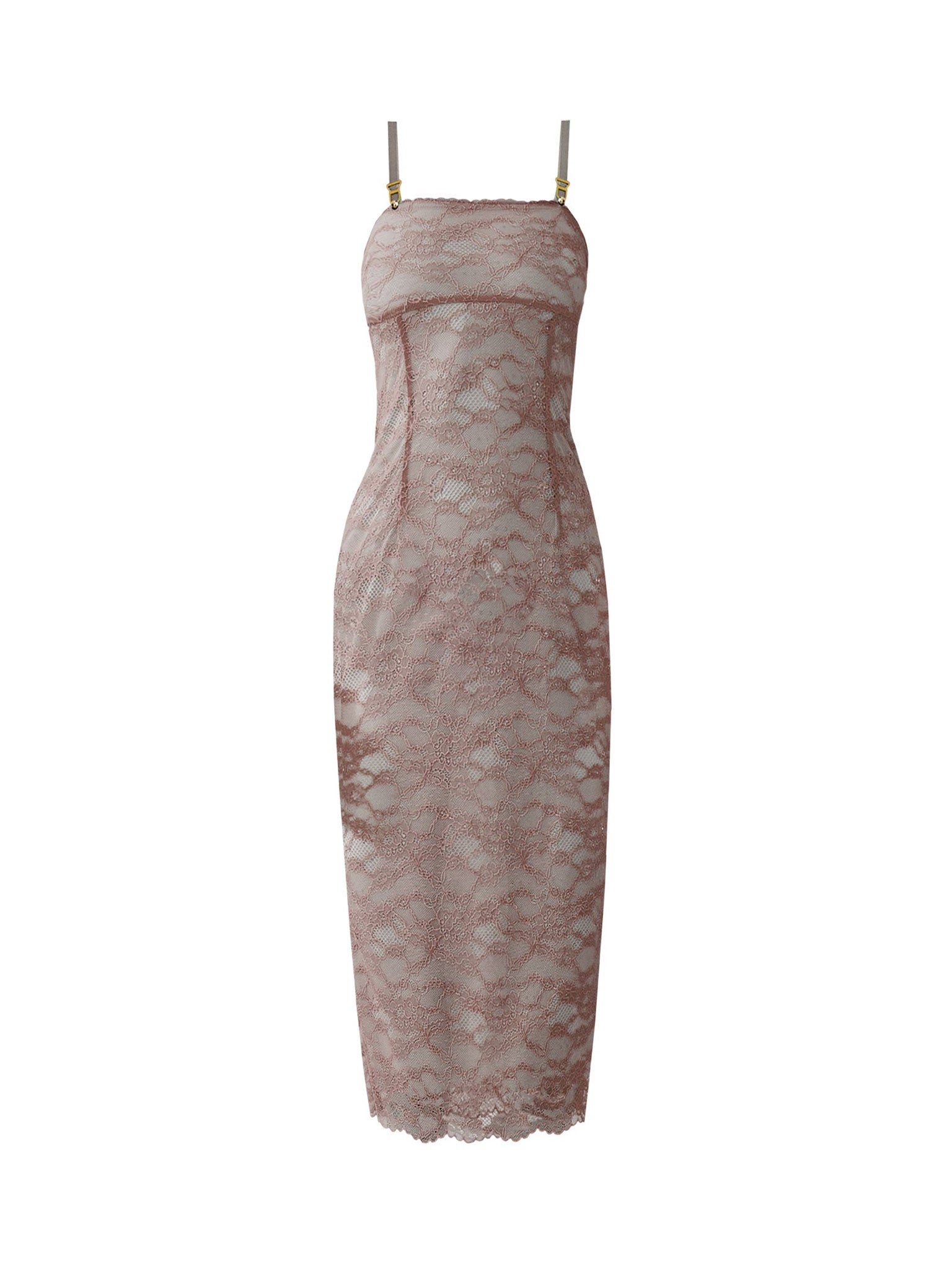 This midi dress allows you to take the allure of lingerie beyond the bedroom - it has a slimming slip silhouette with delicate lace. Gold plated hardware features adjustable bra straps and delicate lace scallop edging. - Fully Lined in POSTER GIRL branded powermesh - Outer: 88% Polyamide 12% Elastane - Lining: 93% Polyamide 7% Elastane