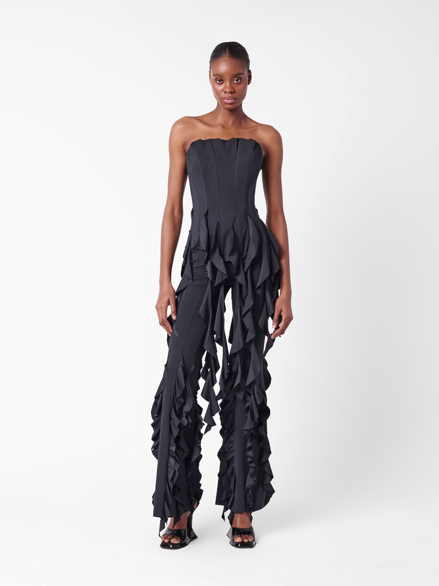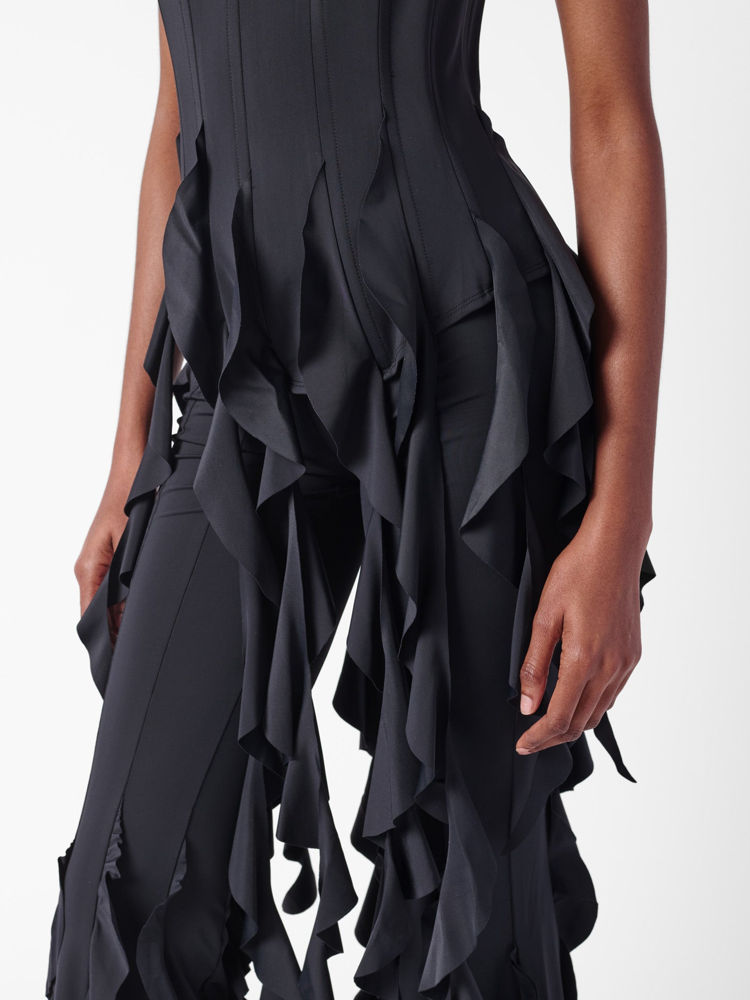Dive in and make a splash with our Calamity Corset. Pleated panelling detail and boning channels to give that waist trainer look. The Calamity Corset is made from recycled lycra, including the cascading draped ruffles. A centre-back Zip fastens the corset and uses a hook and eye at the top for easy closure. - Recycled lycra - Pleated panelling details - Center back zip fastening - Hook & eye at top of zip - Model wears size L - Model Height: 5'8/ 177cm