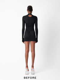There's no going under the radar in the Cat Call mini-dress. Part of our brand new padded shapewear category, the innovative body-contouring and ruched detailing will sculpt your figure like never before, with or without the removable padding for extra support. Features interior corsetry that cinches you in at the waist. With sleek proportions and a sultry jet-black fabric, she can be as styled up or as dressed down as you like. - Removable breast, bum and hip padding - Long sleeves - High round-neckline - Ruched bum detail - Bra fastening behind the neck - Back-centre zip
