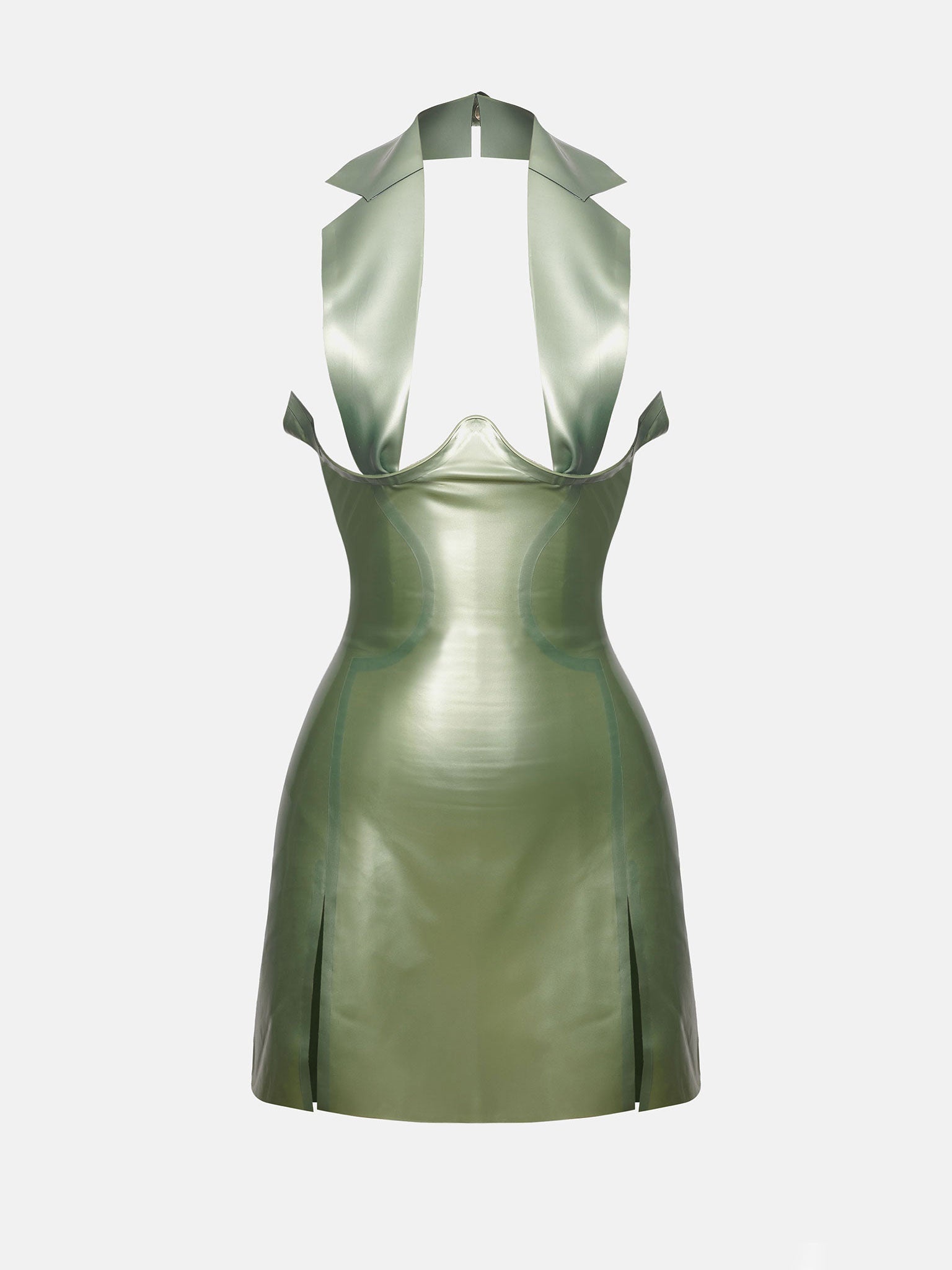 Introducing the latex Chambers Dress in Dollar Bill Green - an elegant and exclusive piece from our SS24 Campaign, as seen on supermodel Cindy Kimberly. The latex lapel adds a unique touch, making this dress a true statement of luxury and seductive glamour. Elevate your wardrobe with this must-have piece. Pair with the Cruella Shoes in White for the complete look. Don't forget to use the latex wipe to give it that extra shine. - 100% Latex - Underwired for support - Center back zip - Buttoned neck fastening - Thigh slits at both sides - Model Height: 5'6" / 172cm and wears size S