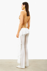 Description The Elle Trousers are brand new from the Resort 23 collection. Crafted from semi-sheer luxurious stretch mesh. With panelled detailing and a ruffled skirt overlay, this style has a slim fit through the thighs before falling to flared hems. Pair with the Dolly Bodysuit for the complete look. - As seen on the Miami 23 runway. - 65% Nylon 35% Spandex - Model Height: 5'9"/ 175cm and wears size S