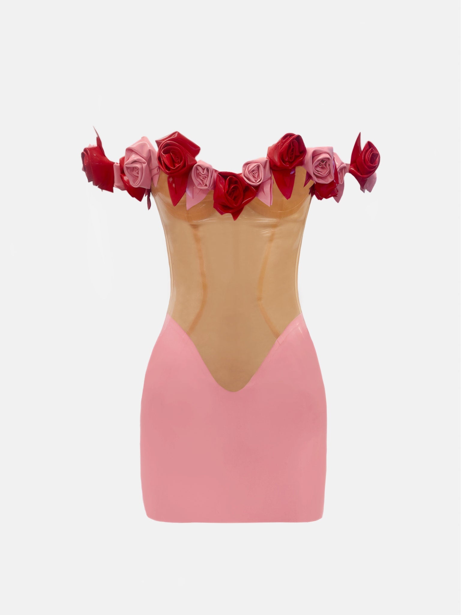Introducing our exclusive Fantasy Dress. This dreamlike mini dress has been meticulously hand-crafted in our London atelier. Red and pink latex roses bloom from the bust and drape across the shoulders and around a transparent bust and midriff nipped in to bring your fantasy to life. Don't forget to use the latex wipe to give it that extra shine. We recommend going down a size in our latex to be super snatched. Please allow 28 days from date of order placed for the delivery. - Ultra shine off the shoulder mini dress - 100% Latex - Hand crafted red & pink latex flowers - Center back zip fastening - Model wears size XS - Model Height: 5'9.5"/ 176cm