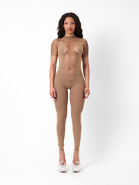 Meet the Juju Jumpsuit. Designed with a two-tone beige fishnet fabric, our crew neck short sleeved jumpsuit features leaf detailing to accentuate your silhouette. Pair with the Glass Slippers for the complete look. Always remember, the brand logo is stamped into the lower back of all designs as POSTER GIRL's mark of authenticity. - The jumpsuit is one size and can stretch from a UK size 6 - 18 - Short sleeved jumpsuit - Rhinestone heart button fastening at the back - Model Height: 5'6" / 168cm