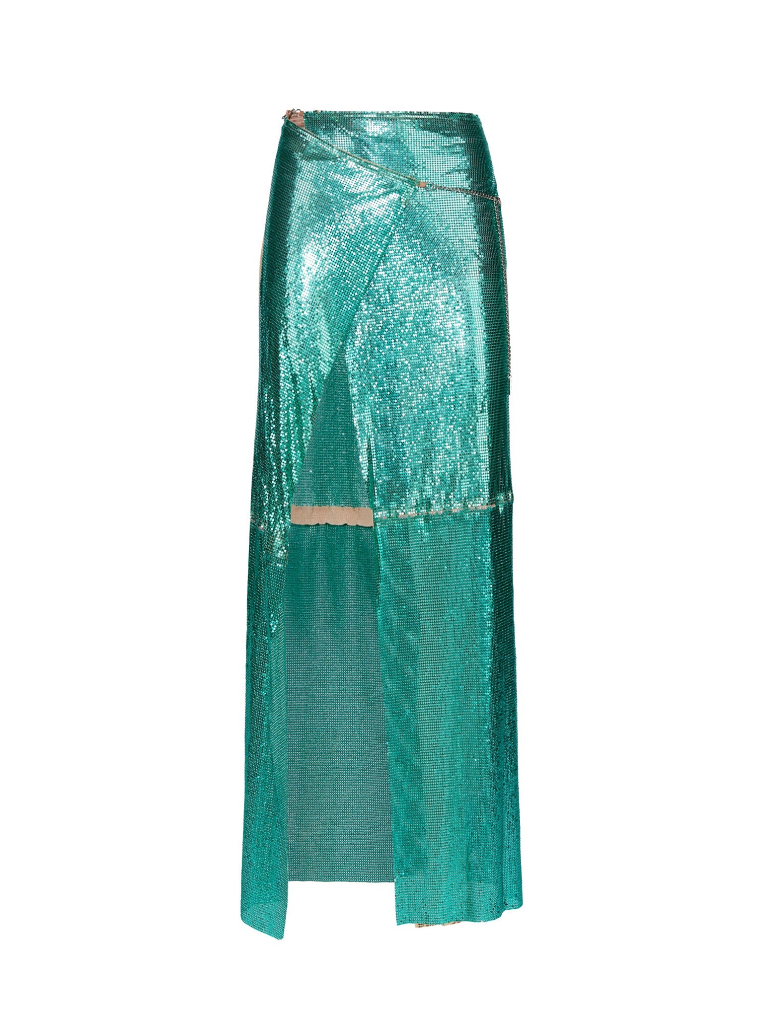The Pamela Show Skirt is crafted from our micro metal-mesh and wraps with ease around the waist into an asymmetric full length hem. Designed to sit at your natural waist, custom fastenings & chain allows the wearer to adjust the fit accordingly. - Partially lined in POSTER GIRL logo mesh - Outer: 100% Aluminium - Lining: 93% Polyamide 7% Elastane