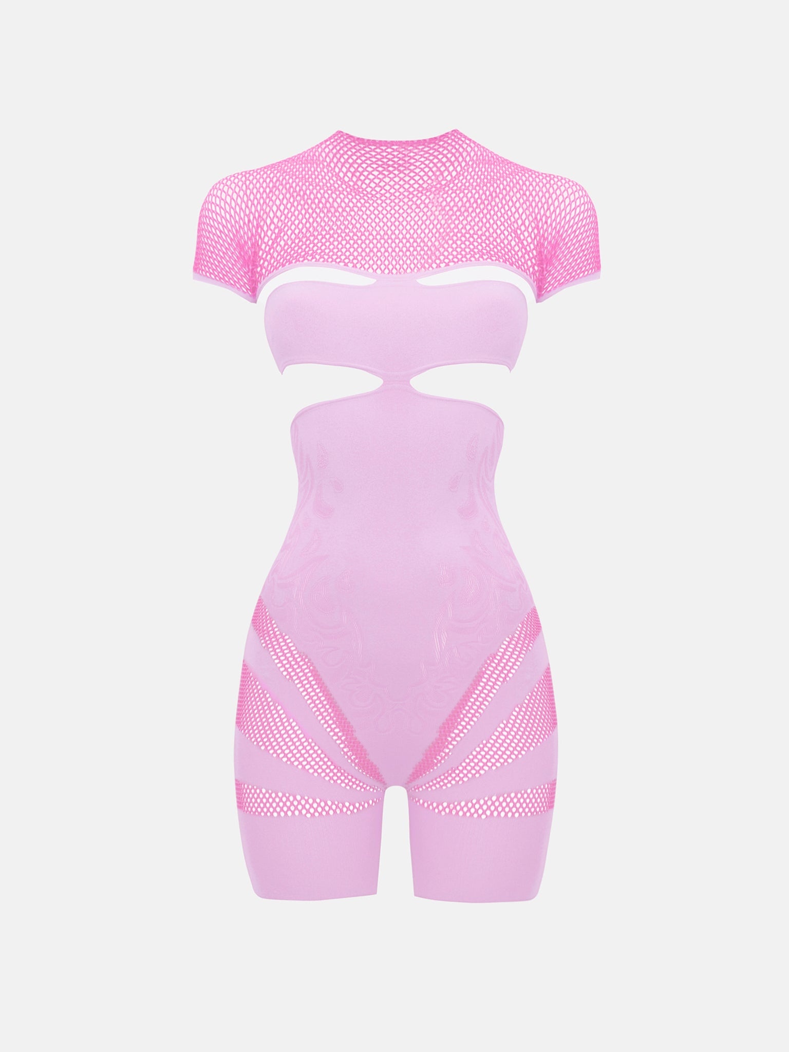 The Pollard Playsuit is patterned with flame and fishnet detailing that add a fierce and striking touch. Designed with cut-outs at the bust, this unique and versatile two tone playsuit is a bold wardrobe piece and can be layered or worn solo. Pair with the Ursula Mules in Patent Pink. Always remember, the brand logo is stamped into the lower back of all designs as POSTER GIRL's mark of authenticity. The playsuit is one size and can stretch from a UK size 6 - 18 - Rhinestone heart button fastening at the back