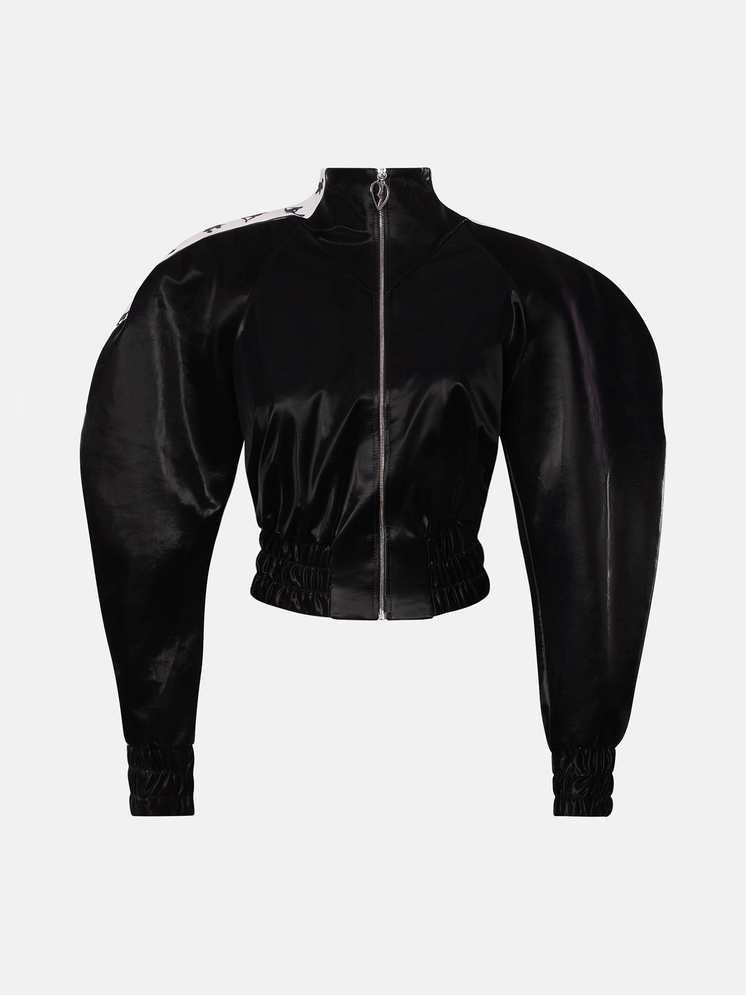 Our Premier Tracksuit Top is bad and boujie. With exaggerated button sleeve shoulder pads with PG heart logo custom zip puller, attached to a silver center front zip. Designed with an elasticated waistband hem in a slightly cropped style. The glossy fabric is fully lined. - Exaggerated bullon sleeve shoulder pads - PG heart logo custom center front - zip puller - Elasticated waistband hem - Slightly cropped - Glossy fabric - Model wears size S - Model Height: 5'10/ 178cm