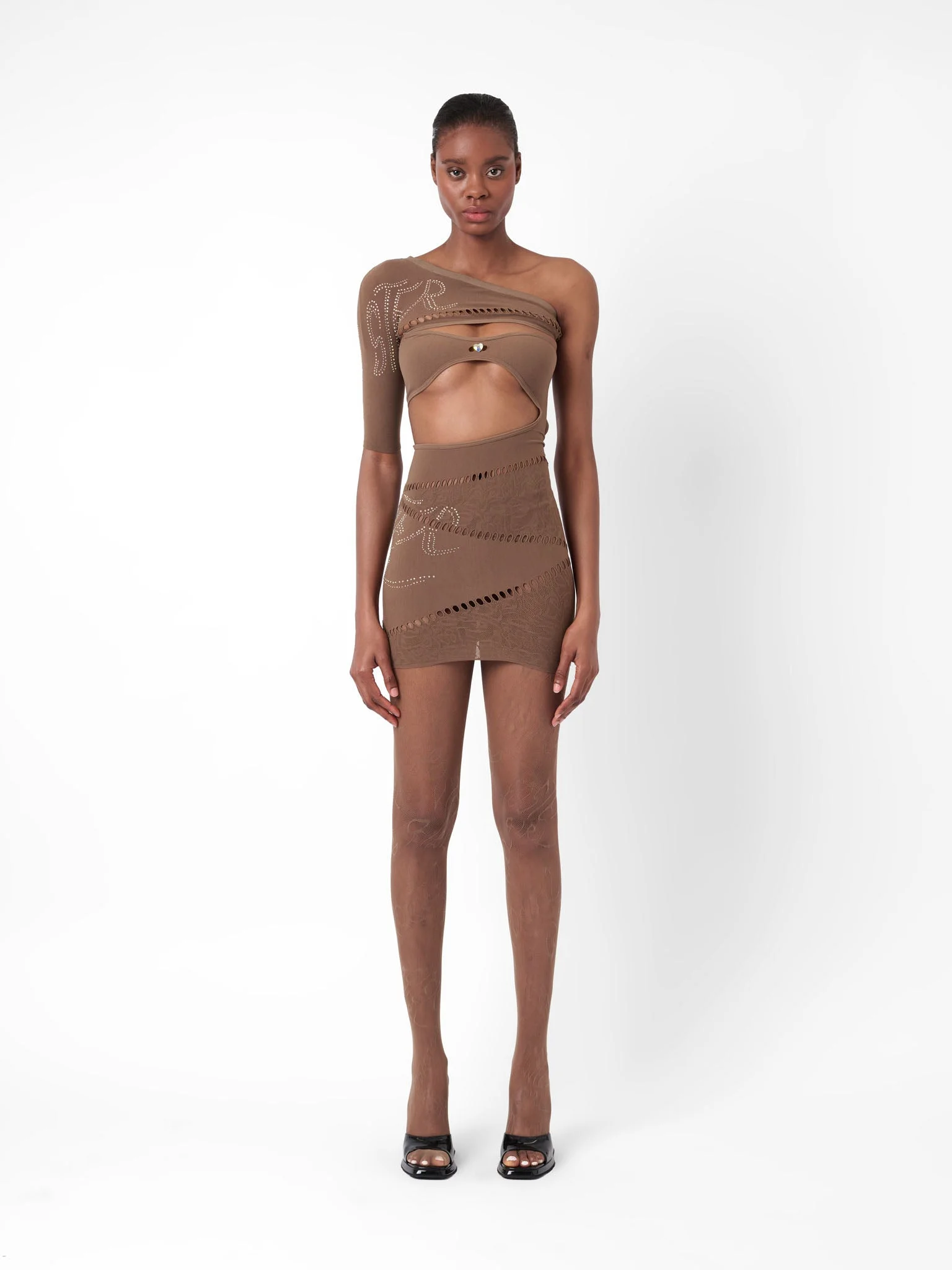 The Robin Dress uniquely designed with our iconic cutout peep holes that descend on the bust, arm and hips and features our brand new psychedelic swirl logo lace. Murmurations of iridescent rhinestones swarm front & back, and our signature suctioning shapewear sweeps your curves to perfection. POSTER GIRL's brand logo is always stamped into the lower back of each garment, confirming its authenticity. The jumpsuit is one size fits most (UK 6-18) COMPOSITION 98% Polyamide 2% Spandex