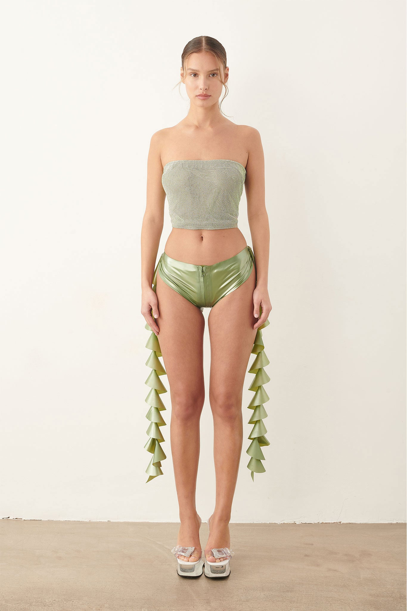 Introducing the Rosalyn Top in a new rhinestone green treasure style as part of our SS24 collection. Crafted from green hued rhinestones, our bandeau top features a lace up back closure which can be adjusted for the perfect fit. The Rosalyn top has been handmade in London with each sheet of chainmail cut, linked and sewn together by hand to achieve the perfect slink. Dazzling with rhinestones, this top is guaranteed to have all eyes on you! As worn by Alana Champion in our SS24 campaign with our latex Paulette shorts. - Made from luxurious aluminum metal - Bandeau top - Lace up adjustable back - Fully lined with logo stretch mesh - 50% Aluminum 50% Glass - Model is 177cm/ 5ft 9.5 Chainmail is unlike most fabrics so it is important to take care when trying on. Chainmail ranges from XS-XL and does not stretch. Never force the garment on otherwise the chainmail will rip. If you are in-between sizes, we recommend sizing up.