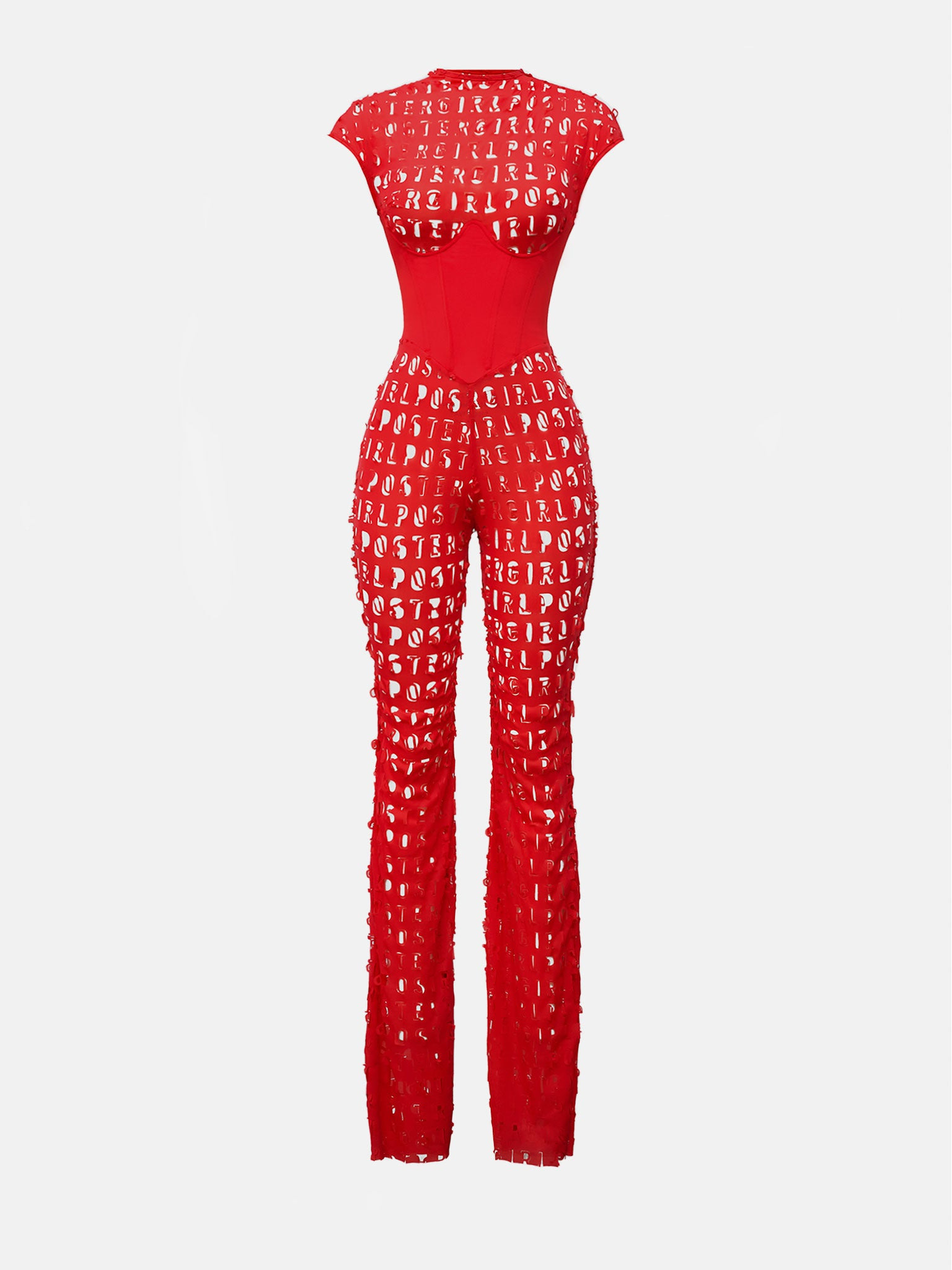 You say jump and they'll say 'how high'. Our Rossi Jumpsuit uses our custom PG laser cut powermesh fabric to give a peak of what's underneath. The built-in corset with boning is made of thick lycra and has underwire to shape and push you up. Designed with a high t-shirt neckline and short capped sleeves, the centre back zip keeps the tight fit. The flared hem leg is finished with a raw cut. - Custom PG laser cut powermesh fabric - Center back zip - Short capped sleeve - Flared hem leg - Boning and underwire in corset - Model wears size S - Model Height: 5'11/ 180cm
