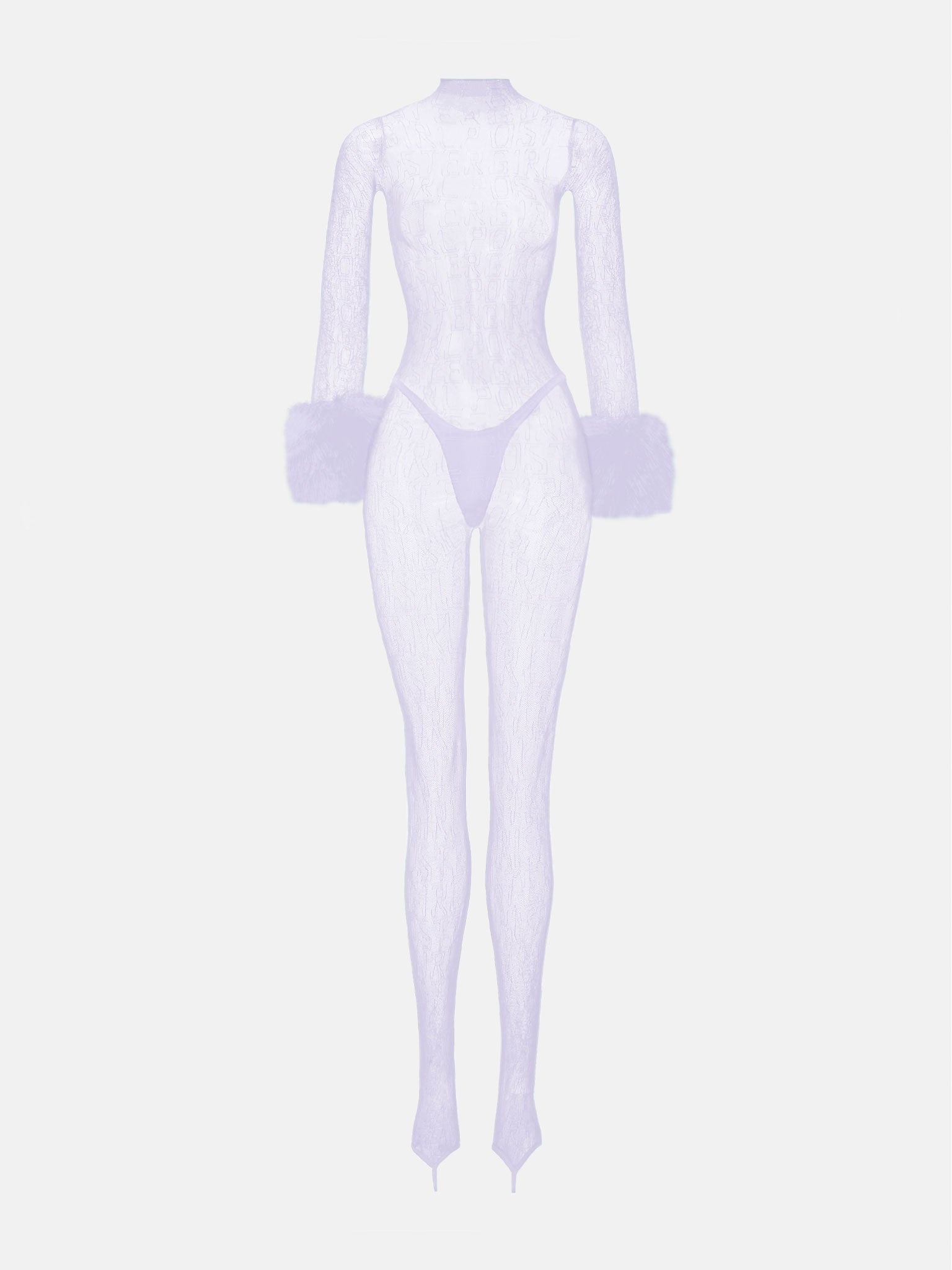 Uncover the enchantment of the Trophy Jumpsuit. Designed in a delicate custom logo translucent lilac lace, this sheer jumpsuit features detachable marabou feather wrist cuffs and feet stirrups to elongate the legs. We recommend styling with our Niparon Premium Nipple Covers. The Trophy Jumpsuit includes a matching lilac thong. The jumpsuit is one size and can stretch from a UK size 6 - 18 - Detachable marabou feather button wrist cuffs - Includes matching coloured thong - Rhinestone heart button neck fastening - Foot stirrups (can be worn between toes or under the foot) - Model Height: 5'8" / 176cm