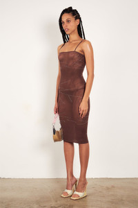 This Vanderbeck Dress is the perfect combination of fashion-forward glam and comfortable shapewear. It's designed to follow your body's curves while flattering your shape, all in a sophisticated old money brown colour accented with rhinestones and featuring POSTER GIRL in a scroll motif. A must-have for any wardrobe! - Spaghetti straps - Designed in London, Made in Italy - Cracked glass rhinestone design - Sculpting hosiery shapewear - 88% Polyamide, 12% Elastane - Model is 5"10 /178cm