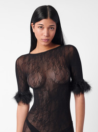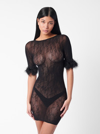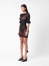 The Vanderpool Dress is cut from a delicate custom logo sheer black lace. This figure skimming mini dress features marabou feather detailing on the sleeves and an adjustable lace-up back which can be altered to your desired fit. The dress is one size and can stretch from a UK size 6 - 18. - Adjustable lace up back with marabou feather pom poms - Sheer lace - Marabou feather sleeve detail