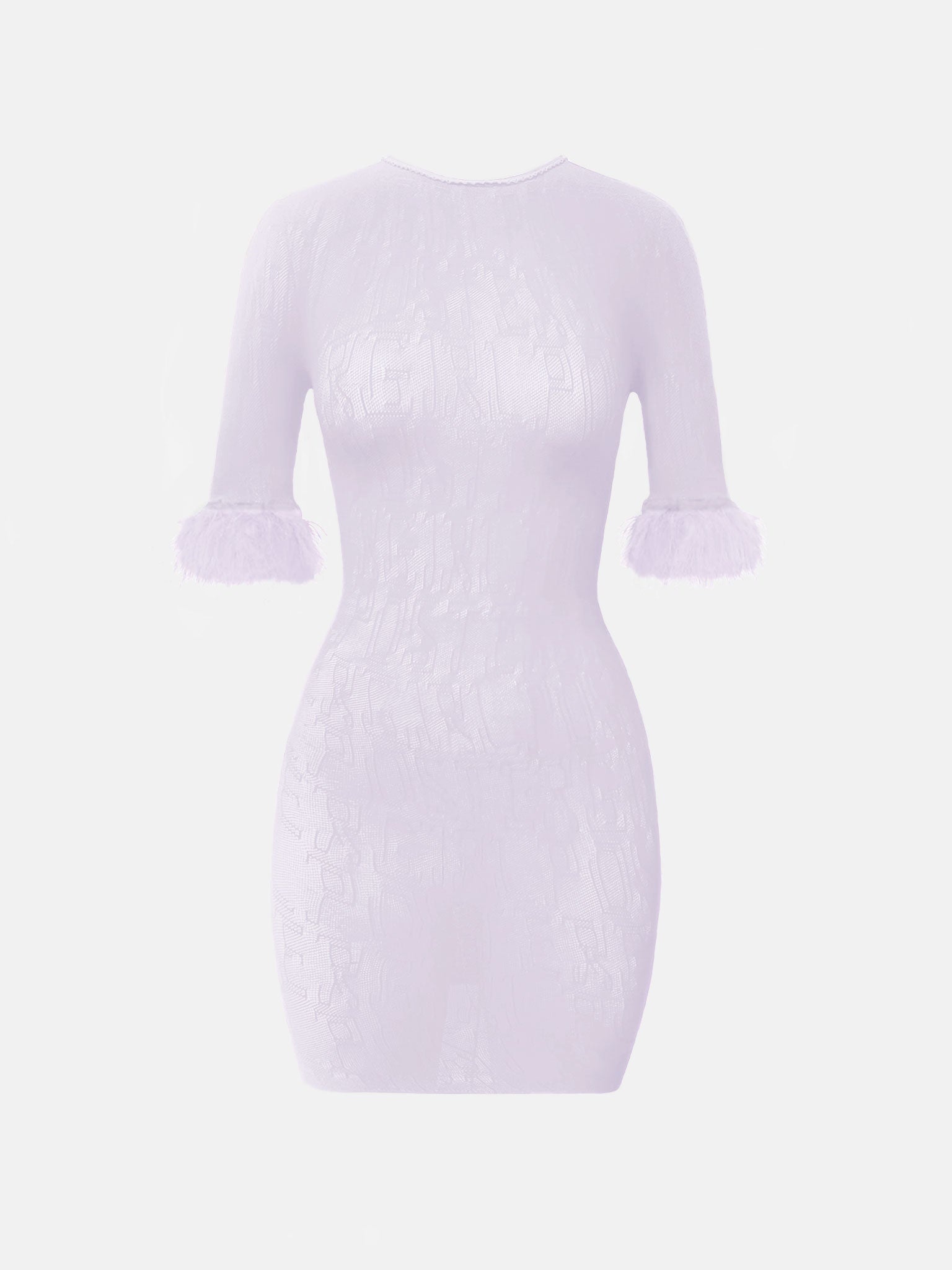 The Vanderpool Dress is cut from a delicate custom logo sheer lilac lace. This figure skimming mini dress features marabou feather detailing on the sleeves and an adjustable lace-up back which can be altered to your desired fit. The dress is one size and can stretch from a UK size 6 - 18 - Adjustable lace up back with marabou feather pom poms - Sheer lace Marabou feather sleeve detail - Model Height: 5'7"/ 174cm