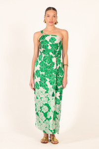 Long dress in viscose satin One-shoulder dress with asymmetrical gold ring embellishment Pareo-style wrap silhouette Attached waist tie finished with tassel trimming Adjustable shoulder strap Smocked back Side pocket Placement printed Crafted with LENZING ECOVERO branded viscose fibers, derived from renewable wood sources for a lower environmental impact. LENZING and ECOVERO are trademarks of Lenzing AG. Each piece is crafted from an exclusive print, hand-applied using traditional, time-honored techniques. This rare artisanal expertise results in slight color variations, a hallmark of the unique character of every creation. Aurelie wears a size S (US 4 / EU 36 / UK 8) and is 5'9" (175 cm) tall. Poupette St Barth - Your Styles