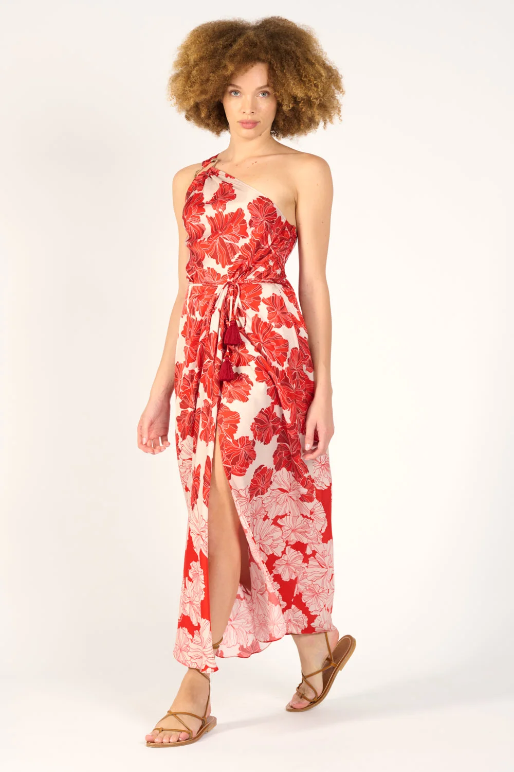 Long dress in viscose satin One-shoulder dress with asymmetrical gold ring embellishment Pareo-style wrap silhouette Attached waist tie finished with tassel trimming Adjustable shoulder strap Smocked back Side pocket Placement printed with flower bunch motif Crafted with LENZING ECOVERO branded viscose fibers, derived from renewable wood sources for a lower environmental impact. LENZING and ECOVERO are trademarks of Lenzing AG. Each piece is crafted from an exclusive print, hand-applied using traditional, time-honored techniques. This rare artisanal expertise results in slight color variations, a hallmark of the unique character of every creation. Aurelie wears a size S (US 4 / EU 36 / UK 8) and is 5'9" (175 cm) tall. Poupette St Barth - Your Styles