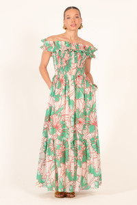 Long dress in cotton mousseline Off-the-shoulder design Fully smocked top Wide two-layer ruffled shoulder Lined with viscose Side pockets Each piece is crafted from an exclusive print, hand-applied using traditional, time-honored techniques. This rare artisanal expertise results in slight color variations, a hallmark of the unique character of every creation. Aurelie wears a size S (US 4 / EU 36 / UK 8) and is 5'9" (175 cm) tall.