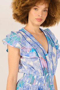 Mini dress in viscose V-neckline with delicate ruffles Button-down front Flared skirt with gathered details Short puff sleeves Side pockets Each piece is crafted from an exclusive print, hand-applied using traditional, time-honored techniques. This rare artisanal expertise results in slight color variations, a hallmark of the unique character of every creation. Aurelie wears a size S (US 4 / EU 36 / UK 8) and is 5'9" (175 cm) tall. Poupette St Barth - Your Styles