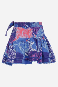 The Chantal Mini Skirt stands out with its meticulously crafted details, a hallmark of Poupette St Barth. Its waistband features an asymmetrical horizontal cut adorned with a delicate decorative bow. The skirt's ruffle is enhanced with openwork stitching and a lace-trimmed hem, while the smocked back ensures easy wear. Versatile and stylish, the Chantal Skirt pairs effortlessly with a simple top or a matching piece in the same print, striking the perfect balance between casual charm and refined elegance. Shown here in the exclusive Blue Ashanti pattern, hand-printed with screen frames.