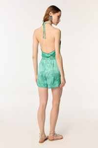 The Isabelle short stands out with its fluid viscose satin fabric and its elegant cut. Italian pockets add practicality, while the hem, delicately outlined with cross-stitching, provides a subtly refined touch. Signed by Poupette St Barth, the Isabelle short embodies a casual chic style, perfect for a sophisticated summer look. Crafted with LENZING™ ECOVERO™ branded viscose fibers, derived from renewable wood sources for a lower environmental impact. LENZING™ and ECOVERO™ are trademarks of Lenzing AG. Shown here in the exclusive Mint Macro Stelis pattern, hand-printed with screen frames. Nessie wears a small size/US 4/EU 36/UK 8 and is 5'9 (180 cm) tall.