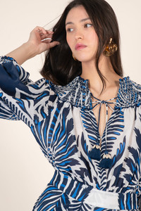 Jumpsuit in cotton mousseline Decorative smocked panel at the neckline Puff sleeves with elasticated cuffs Self-tie strap at neckline finished with tassels Gathered detailing at front and back Hidden shell button closure at center front Smocked waistband for a comfortable fit Asymmetrical tiered skirt design Side pocket Lined with viscose Placement print design Each piece is crafted from an exclusive print, hand-applied using traditional, time-honored techniques. This rare artisanal expertise results in slight color variations, a hallmark of the unique character of every creation. Mae Ling wears a size S (US 4 / EU 36 / UK 8) and is 5'9" (176 cm) tall. Poupette St Barth - Your Styles