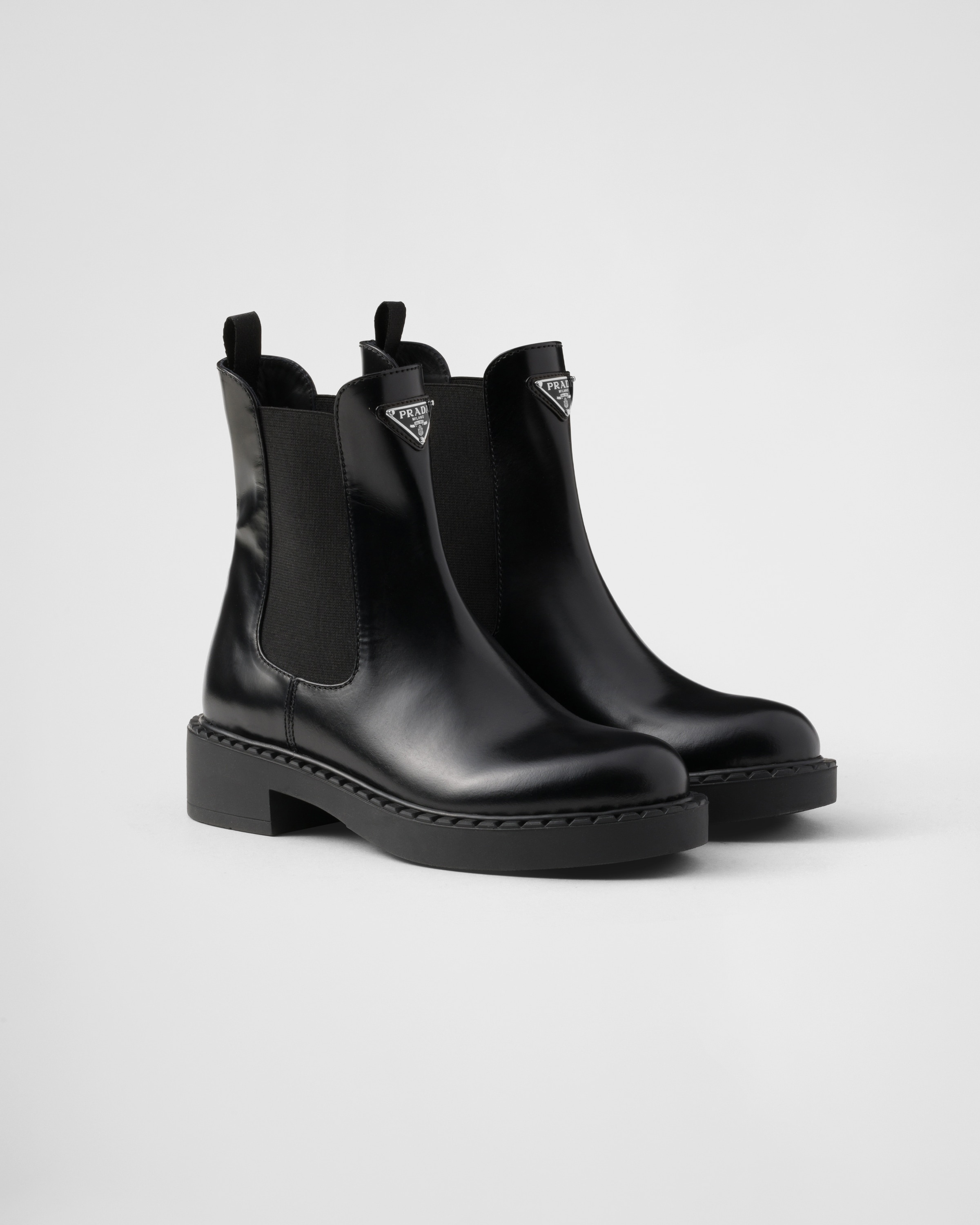 Contemporary silhouette with clean lines for these Chelsea boots made of brushed leather, one of the emblematic materials of Prada collections. The footwear combines a casual character and refined allure in a versatile design completed with comfortable rubber soles. The enameled metal triangle logo embellishes the style with its simple yet distinctive signature. - Product code: 1T703N_055_F0002_F_G050 - Upper with elastic gusset and back loop - Leather lining - Enameled metal triangle logo - Boot shaft height 16 cm - Monoblock rubber sole, 50 mm, with hot-stamped logo - Rubber welt stamped with a serrated effect - Imported MATERIALS Main material: Calfskin