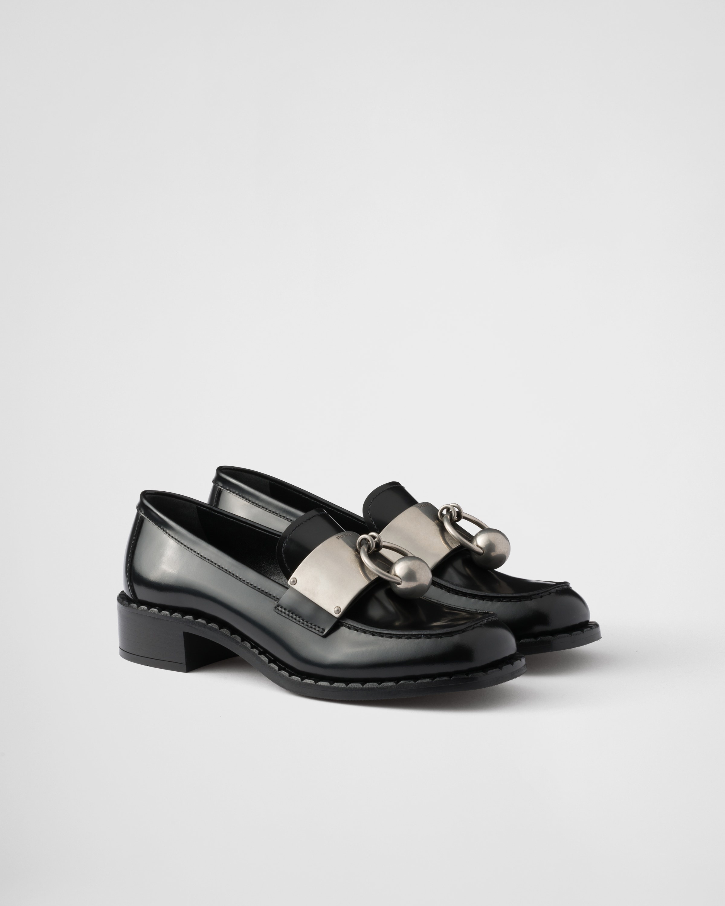 Refined craftsmanship, bold details and unexpected touches add character to these loafers with sophisticated lines. The shoes made of brushed fume leather are defined by metal elements that contrast with the classic silhouette. - Product code: 1D981N_P39_F0002_F_D035 - Upper with logo-engraved metal ornament - Monoblock rubber sole with hot-stamped logo - Heel height 35 mm - Imported MATERIALS Main material: Calfskin