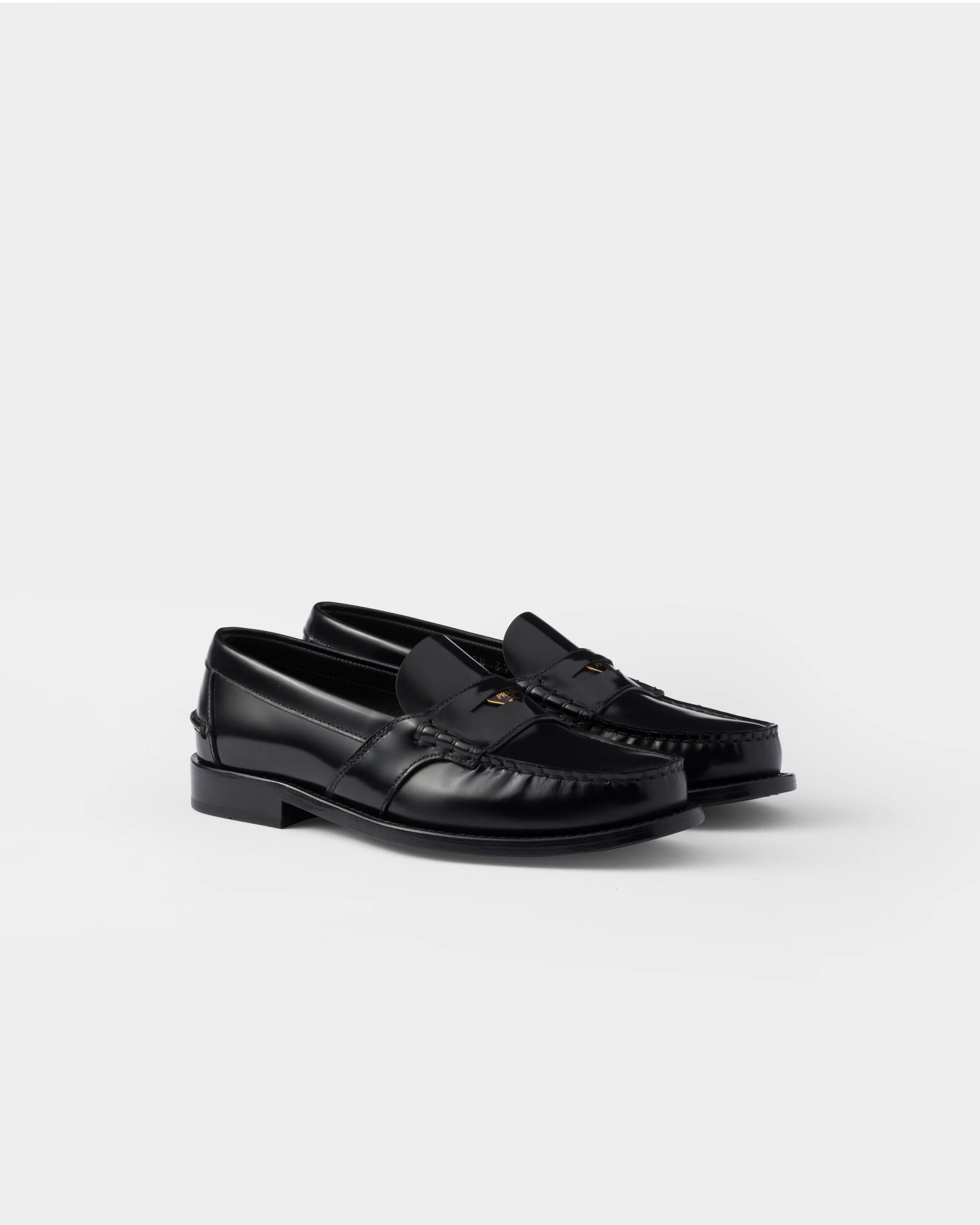 These brushed leather loafers feature a sleek silhouette, blending traditional craftsmanship with modern design. The enameled metal triangle logo subtly embellishes the upper. - Product code: 1D820N_055_F0002_F_020 - Upper with leather band - Enamelled metal triangle logo - Monoblock rubber sole with hot-stamped logo - Heel height: 20 mm - Imported MATERIALS Main material: Calfskin