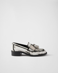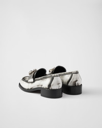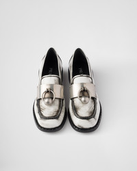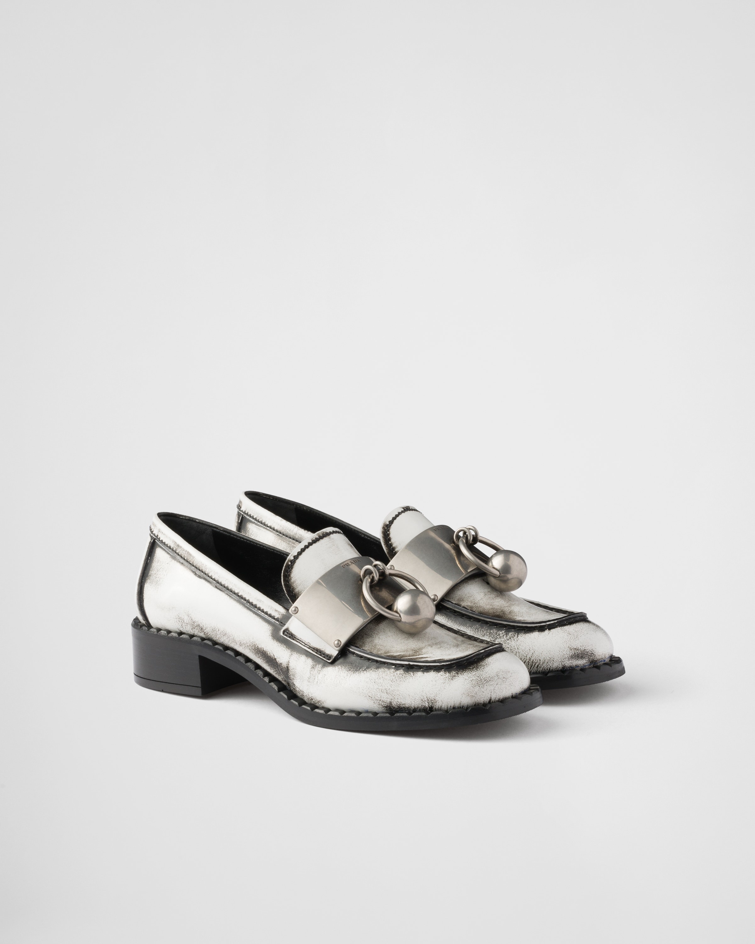 Refined craftsmanship, bold details and unexpected touches add character to these loafers with sophisticated lines. The shoes made of brushed fume leather are defined by metal elements that contrast with the classic silhouette. - Product code: 1D981N_P39_F0009_F_D035 - Upper with logo-engraved metal ornament - Monoblock rubber sole with hot-stamped logo - Heel height 35 mm - Imported MATERIALS Main material: Calfskin