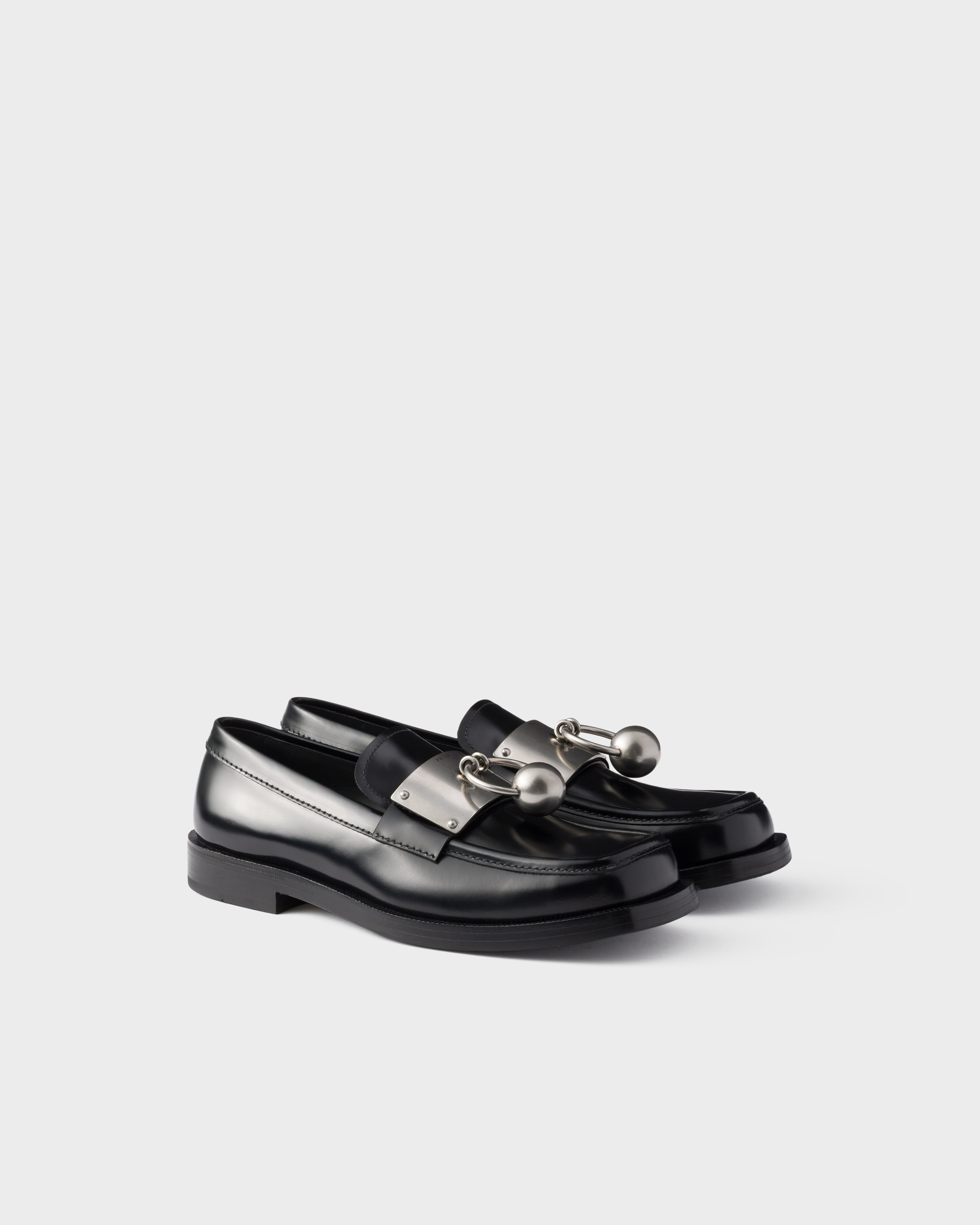 A distinctive aesthetic defines these brushed leather loafers. The silhouette plays with strong geometric lines that outline the upper with a square toe, enriched with an oversized metal ornament that gives this classic footwear a bold look. - Product code: 2DB234_055_F0002_F_X000 - Band with metal ornament - Leather sole with rubber half-sole and heel layer with hot-stamped logo - Heel height: 27 mm - Leather insole - Imported MATERIALS Main material: Calfskin