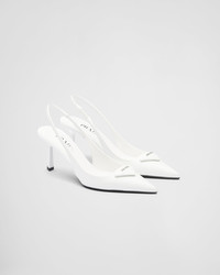 These pumps expressing sophisticated, feminine elegance are made of brushed leather, an emblematic material of Prada since the 90s traditionally used for luxury footwear. The triangle logo returns as a slightly padded leather detail and inspires the geometric line of the heel, which gives the silhouette a modernist note. - Product code: 1I901M_055_F0009_F_DD75 - Screen-printed leather triangle logo - Leather sole with metal lettering logo - 75 mm varnished heel - Imported MATERIALS Main material: Calfskin