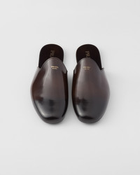 Brushed leather, an emblematic material of Prada collections, gives these minimalist slippers sophisticated allure. The tapered silhouette, characterized by thin rubber soles, is completed with insoles for greater comfort. The screen-printed lettering logo on the upper enhances the sleek and contemporary elegance of the footwear. - Product code: 2S2986_X6O_F0038_F_G012 - Screen-printed lettering logo on the upper - Light rubber sole, 5 mm - Brushed leather insole - Imported MATERIALS Main material: Calfskin