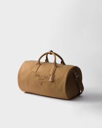 This canvas duffle bag with a light design and sporty style is enhanced with refined leather details. The roomy, versatile style is characterized by a removable shoulder strap, while the tonal embroidered logo completes the accessory with a distinctive note. - Product code: 2VC051_2CYA_F04MO_V_OOO - Canvas handles - Detachable, adjustable woven cotton tape shoulder strap. Maximum length 120 cm - Minimum length: 65 cm - Maximum drop 60 cm - Minimum drop 30 cm - Embroidered logo on the front - Zipper closure - Removable leather key ring with hot-stamped lettering logo - Canvas interior with zipper pocket and patch pocket - Imported Height: 32cm Width: 53cm Length: 32cm MATERIALS Main material: Cotton