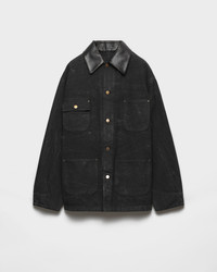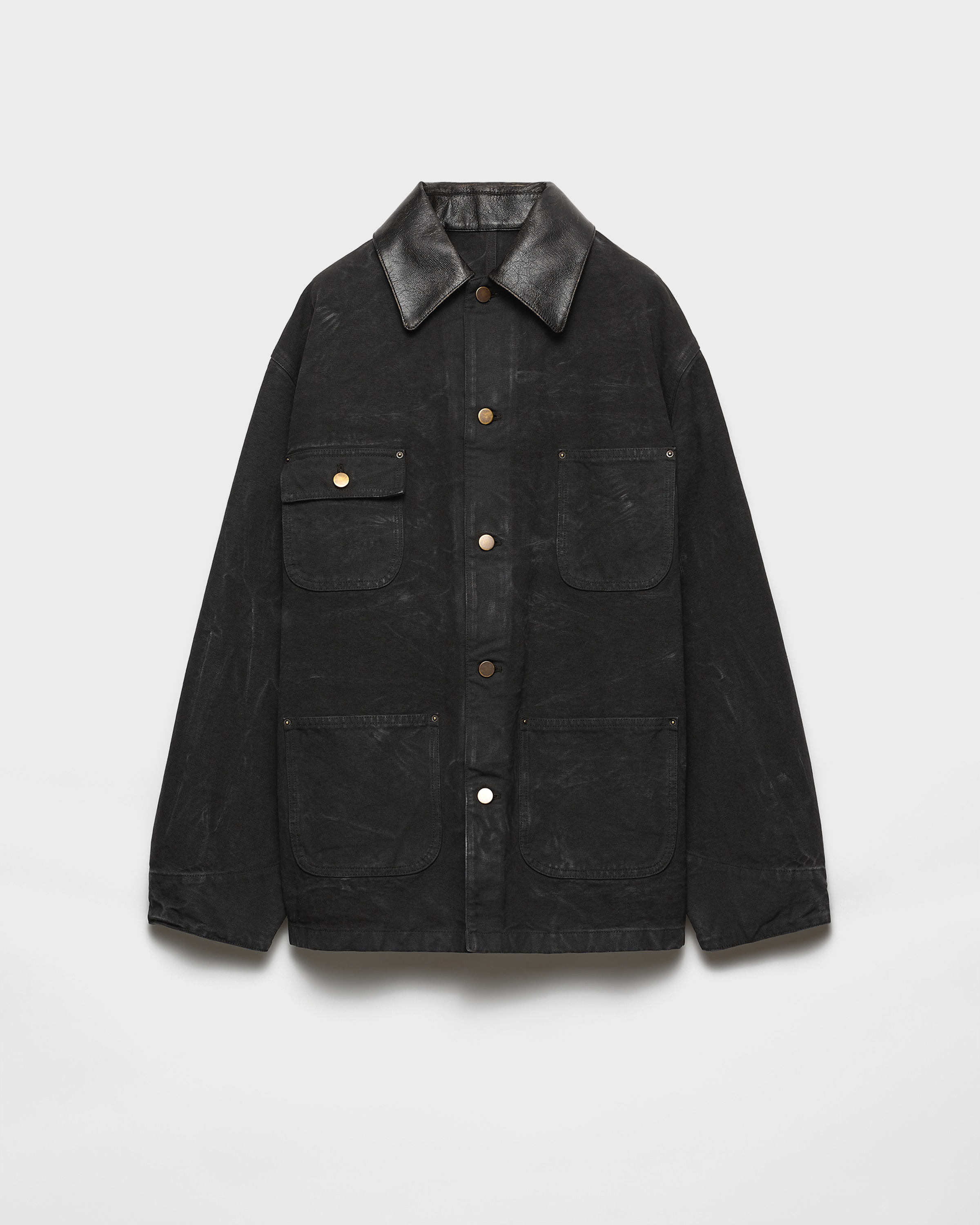 This canvas work jacket, the perfect synthesis of functionality and refinement, is a key piece in the Prada wardrobe. The design reinterprets a workwear classic with a vintage finish created using artisan processes that give dimension to the pragmatic fabric. The oversized silhouette is completed by the leather collar that reveals the refined essence of the style decorated with the triangle logo. - Product code: 29L181_157N_F0002_S_OOO - Unlined - Leather collar - Long sleeves - Button closure - Leather triangle logo - Sleeve hem with buttonhole and two buttons - Patch pockets on the chest, including one with flap - Low patch pockets - Matching stitching - Garment made of dyed and treated canvas - Total length 77 cm, Size: 38 - Imported - The model is 178 cm tall and wears a size 38 Height: 77cm MATERIALS Main material: 100% cotton