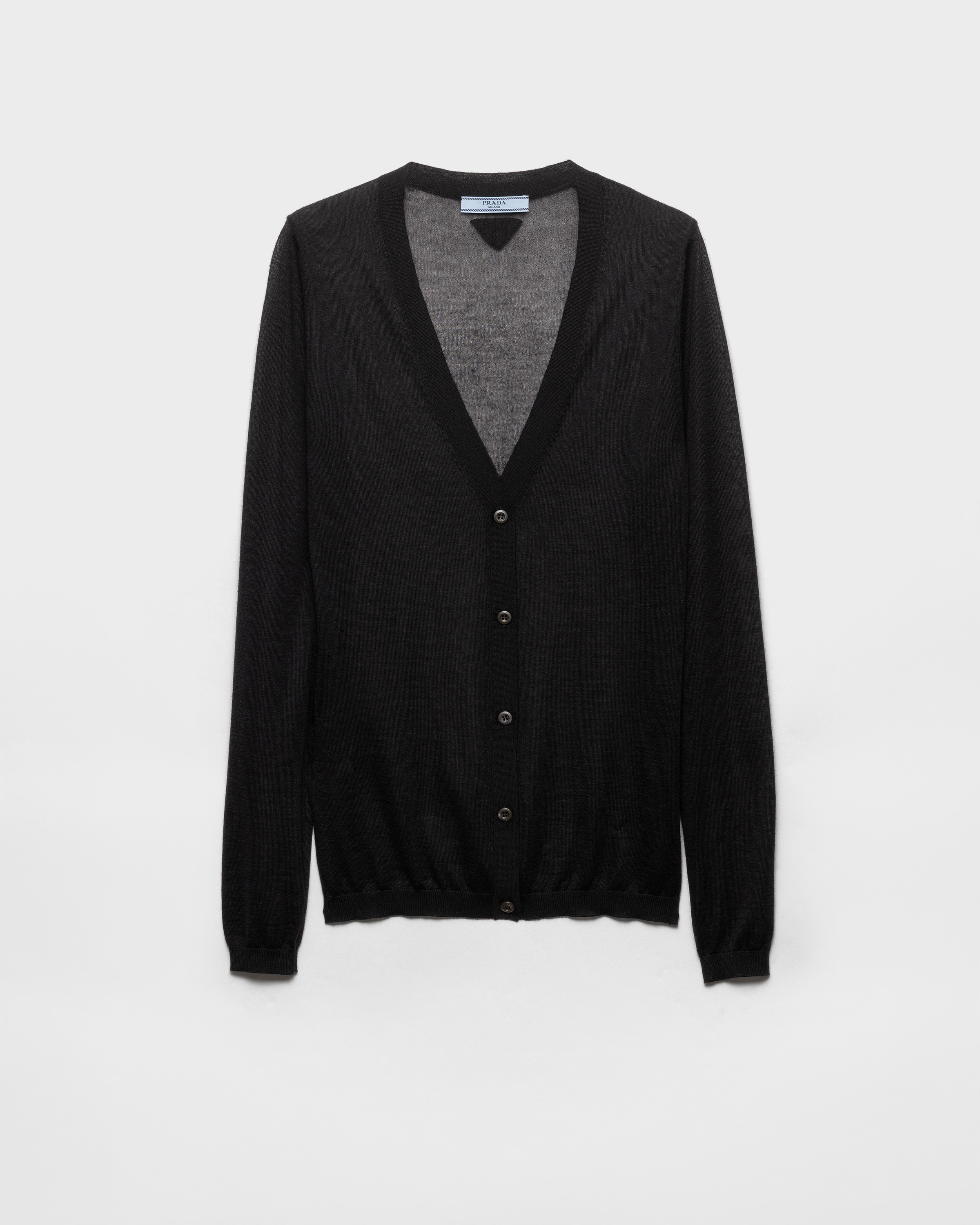 This refined, lightweight cardigan is made with a premium blend of cashmere and silk. The soft, slim silhouette is decorated with the tonal triangle logo. - Product code: P25O10_18DN_F0002_S_OOO - Long sleeves - Plain knit - Boxy fit - Ribbed knit collar - Semi-raglan shoulder - Ribbed knit cuffs and hem - Knit triangle logo - Front button closure - Imported - The model is 178 cm tall and wears a size 38 Height: 64cm MATERIALS Main material: 30% silk 70% cashmere