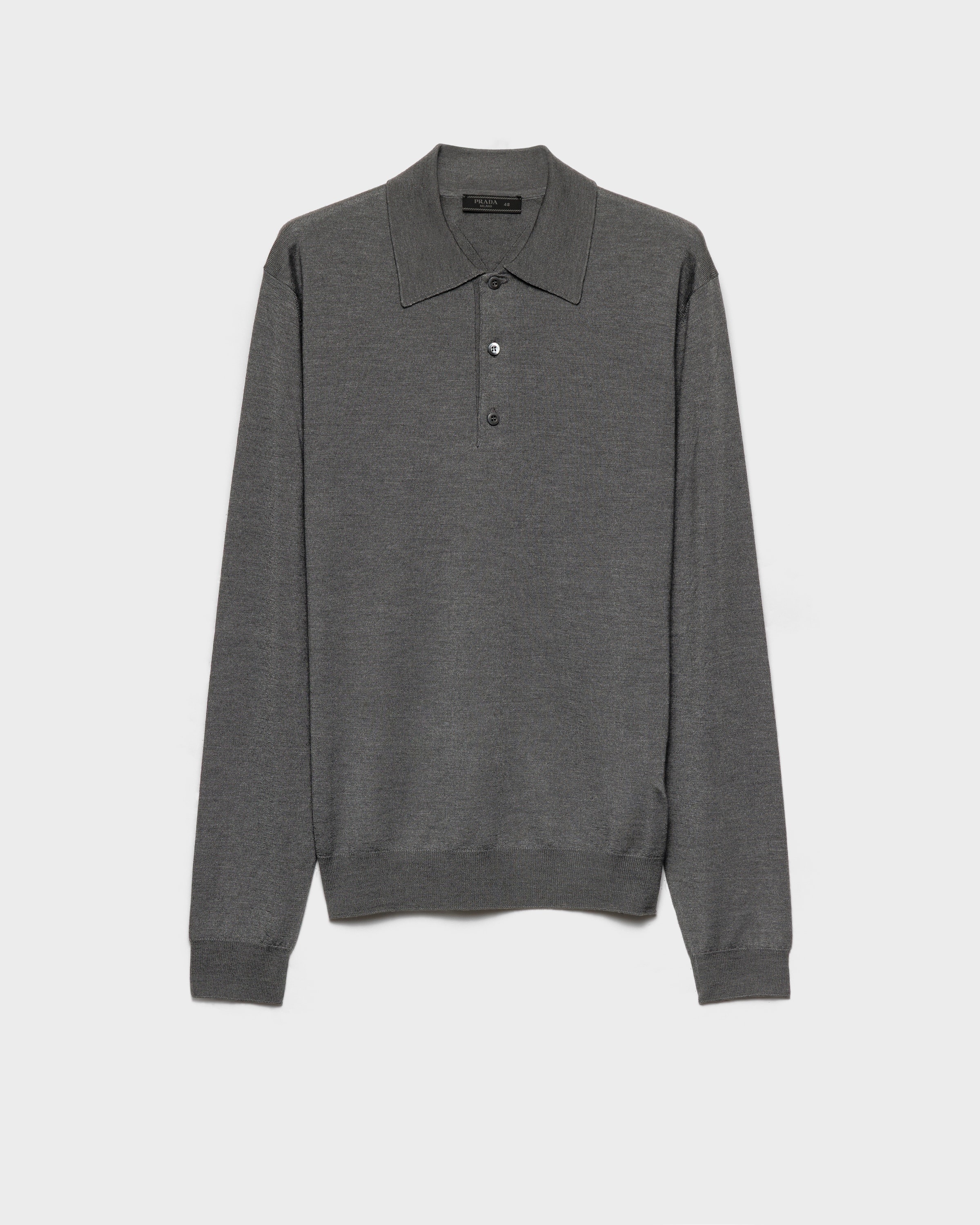 Made with a blend of fine cashmere and silk yarn, this polo shirt with classic lines embodies simple elegance and timeless style. - Product code: UMF031_0B8_F0480_S_OOO - Plain knit - Regular fit - Ribbed knit collar - Semi-raglan shoulder - Ribbed knit cuffs and hem - Knit triangle logo - Front button closure - Imported - The model is 188 cm tall and wears a size 48 Height: 66cm MATERIALS Main material: 30% silk 70% cashmere