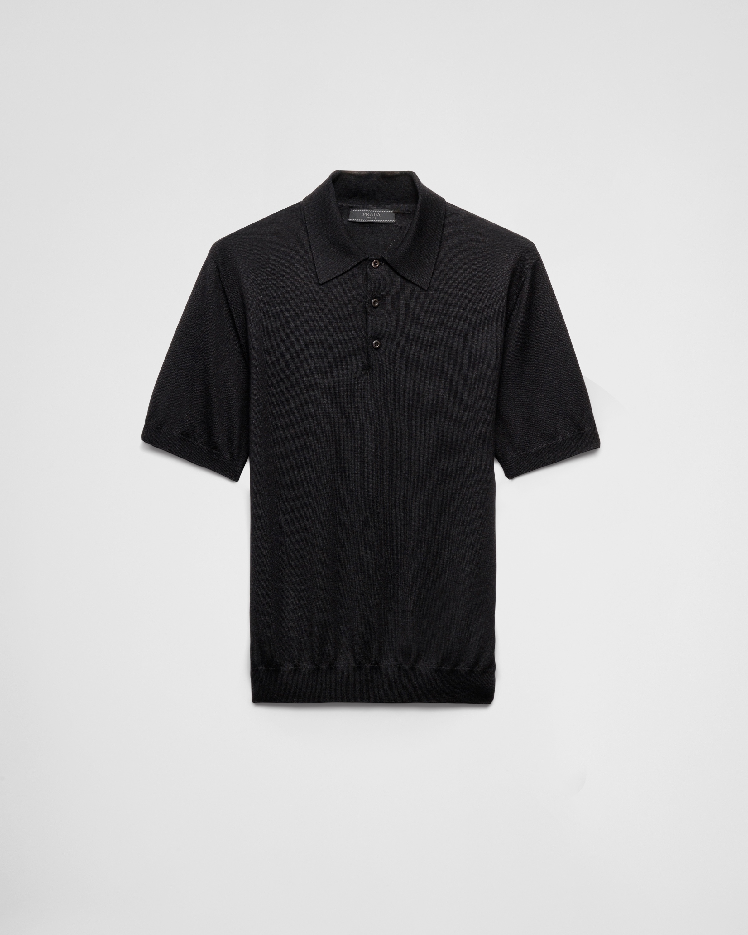 Sleek, contemporary lines define this cashmere and silk polo shirt embellished with the iconic geometric shape of the triangle logo. - Product code: UMF027_0B8_F0002_S_OOO - Plain knit - Regular fit - Ribbed knit collar - Raglan shoulder - Ribbed knit cuffs and hem - Knit triangle logo - Front button closure - Imported - The model is 189 cm tall and wears a size 38 Height: 66cm MATERIALS Main material: 30% silk 70% cashmere