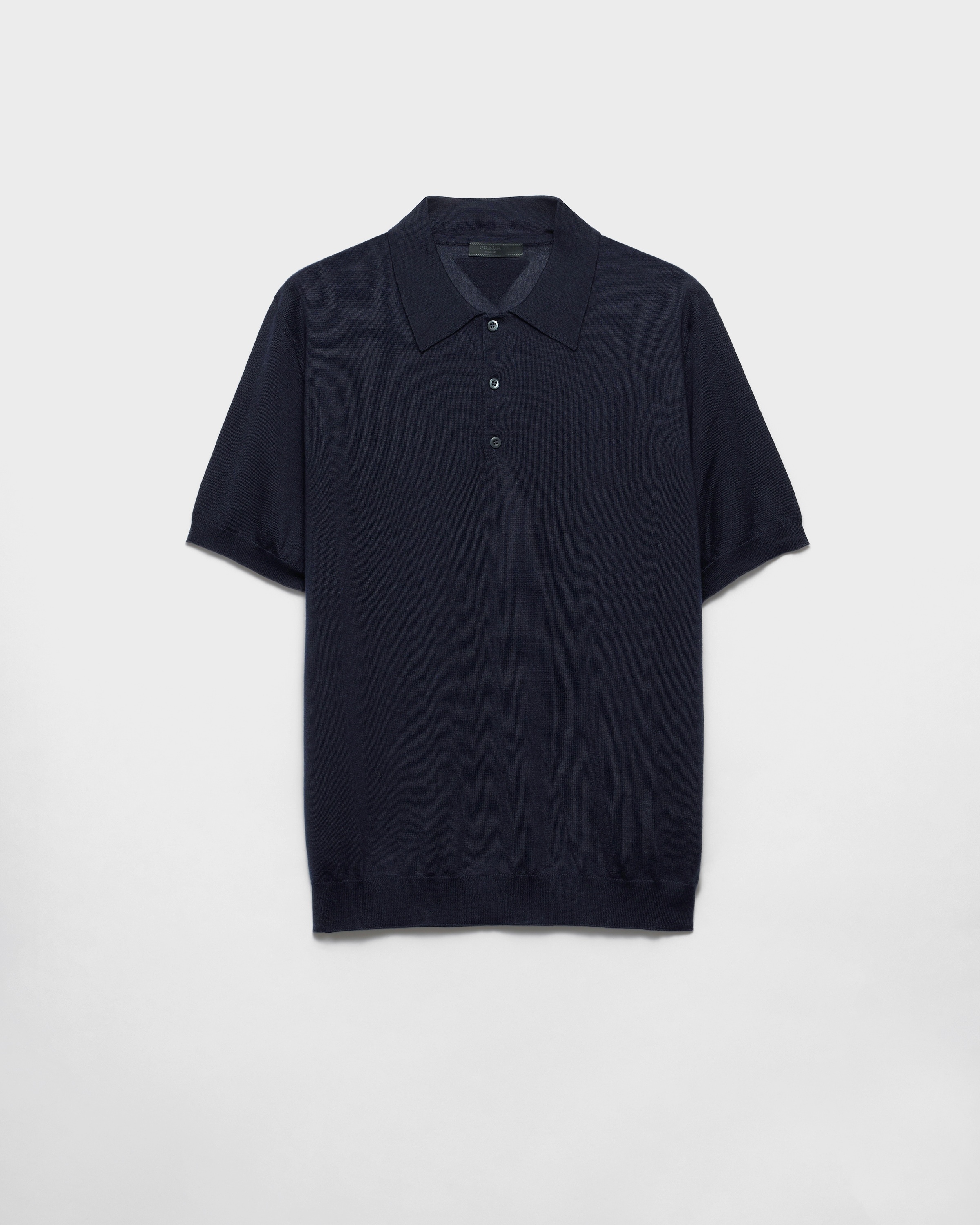 Sleek, contemporary lines define this cashmere and silk polo shirt embellished with the iconic geometric shape of the triangle logo. - Product code: UMF027_0B8_F0008_S_OOO - Plain knit - Regular fit - Ribbed knit collar - Raglan shoulder - Ribbed knit cuffs and hem - Knit triangle logo - Front button closure - Imported - The model is 190 cm tall and wears a size 48 Height: 66cm MATERIALS Main material: 30% silk 70% cashmere