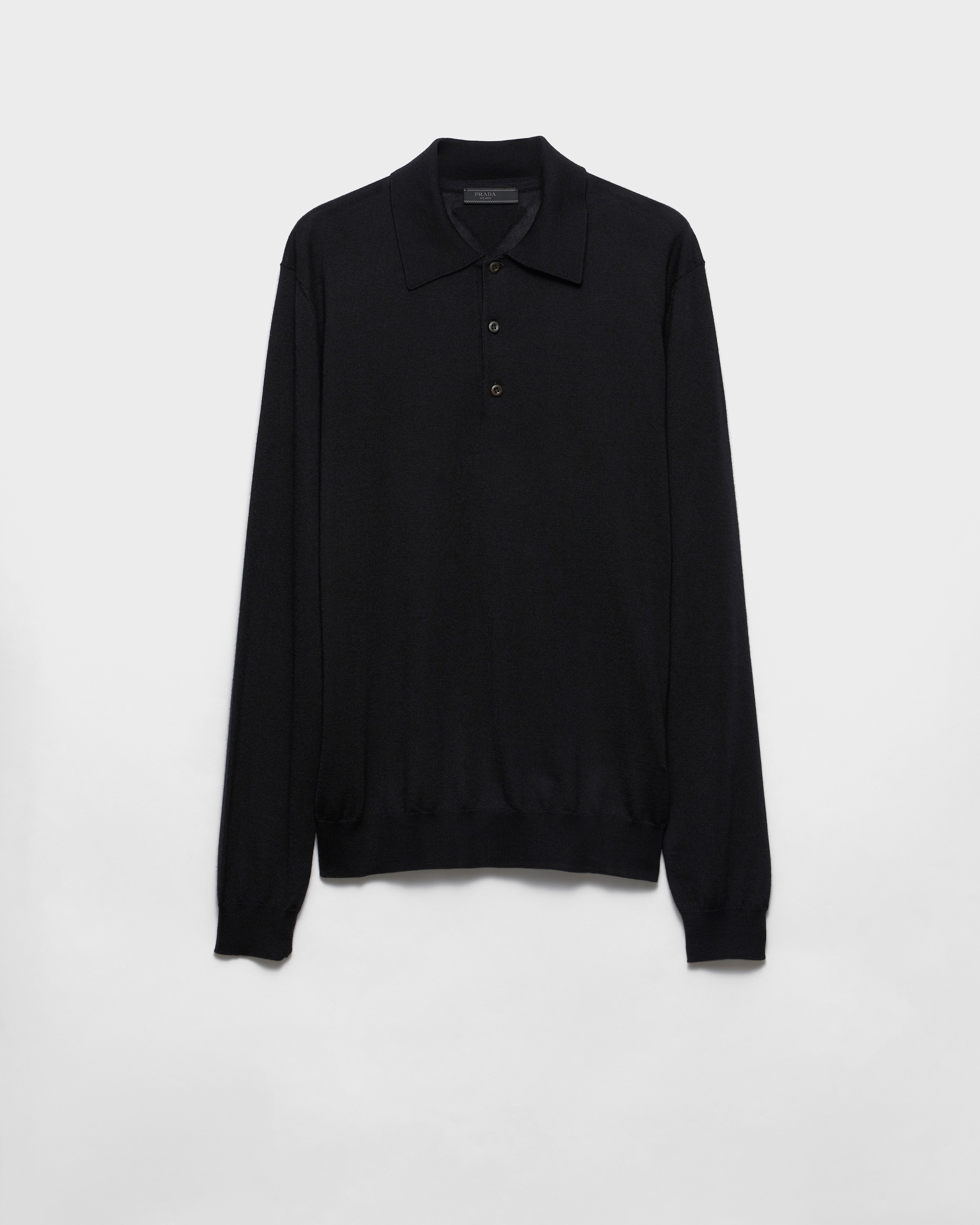 Made with a blend of fine cashmere and silk yarn, this polo shirt with classic lines embodies simple elegance and timeless style. - Product code: UMF031_0B8_F0002_S_OOO - Plain knit - Regular fit - Ribbed knit collar - Semi-raglan shoulder - Ribbed knit cuffs and hem - Knit triangle logo - Front button closure - Imported - The model is 190 cm tall and wears a size 48 Height: 66cm MATERIALS Main material: 30% silk 70% cashmere