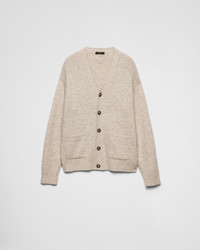 Oversized lines with a relaxed attitude define this cardigan made of fine cashmere and completed with the simple yet iconic shape of the triangle logo. - Product code: UMG345_145M_F0F24_S_OOO - Plain knit - Oversized fit - Ribbed knit trim - Semi-raglan shoulder - Ribbed knit cuffs and hem - Knit triangle logo - Front button closure - Patch pockets - Imported - The model is 189 cm tall and wears a size 48 Height: 74cm MATERIALS Main material: 100% cashmere