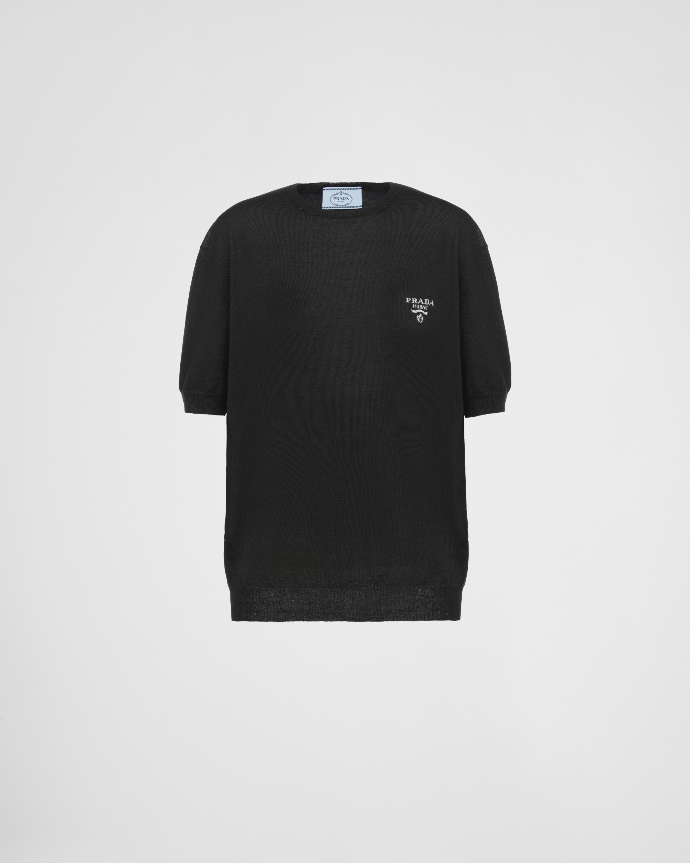 A classic crew-neck design characterizes this plain knit cashmere sweater. The oversized lines of the garment are enhanced by the ribbed knit motif that completes the crew neck, sleeve trim, and hem. The intarsia lettering logo stands out on the front, decorating the garment. - Product code: P24Q1S_102T_F0002_S_221 - Short sleeves - Plain knit - Menswear fit - Ribbed knit crew neck - Semi-raglan shoulder - Ribbed knit sleeve trim and hem - Intarsia logo - Imported - The model is 179 cm tall and wears a size 38 Height: 60cm MATERIALS Main material: 100% cashmere