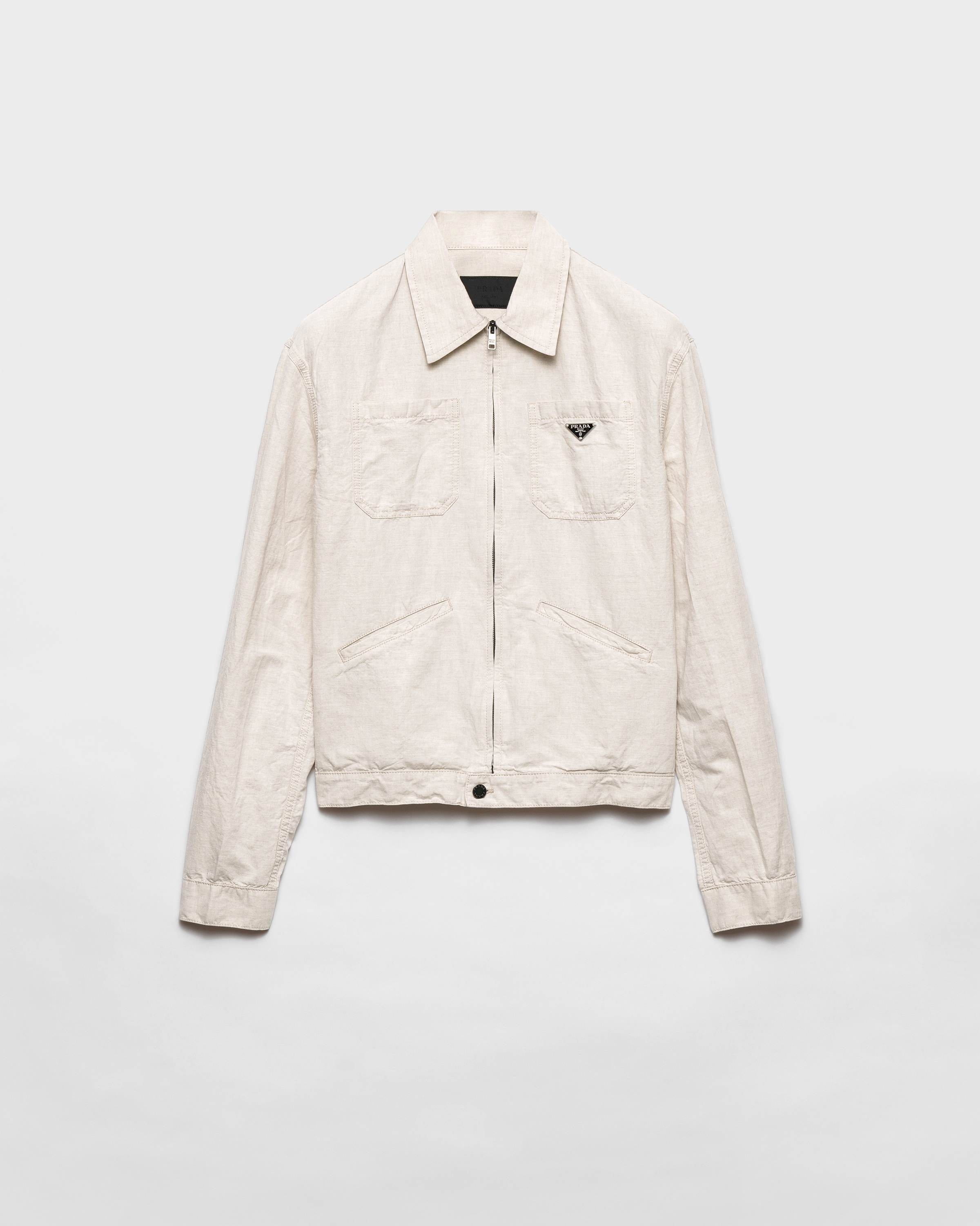 This blouson jacket with a casual attitude and timeless silhouette is made of chambray, emphasized by a rinse treatment that allows the garment to acquire unique natural characteristics over time. The lightweight style is enriched with the iconic triangle logo. - Product code: GEB255_14J2_F0ABR_S_OOO - Rinse treatment - Unlined garment - Classic fit - Shirt-style collar - Long sleeves, cuffs with one button - Zipper closure and front buttons - Patch pockets on the chest - Low welt pockets - Center-back length: 64 cm. Size: M - Straight hem - Triangle logo - Imported - The model is 188 cm tall and wears a size 48 Height: 64cm MATERIALS Main material: 65% cotton 35% linen