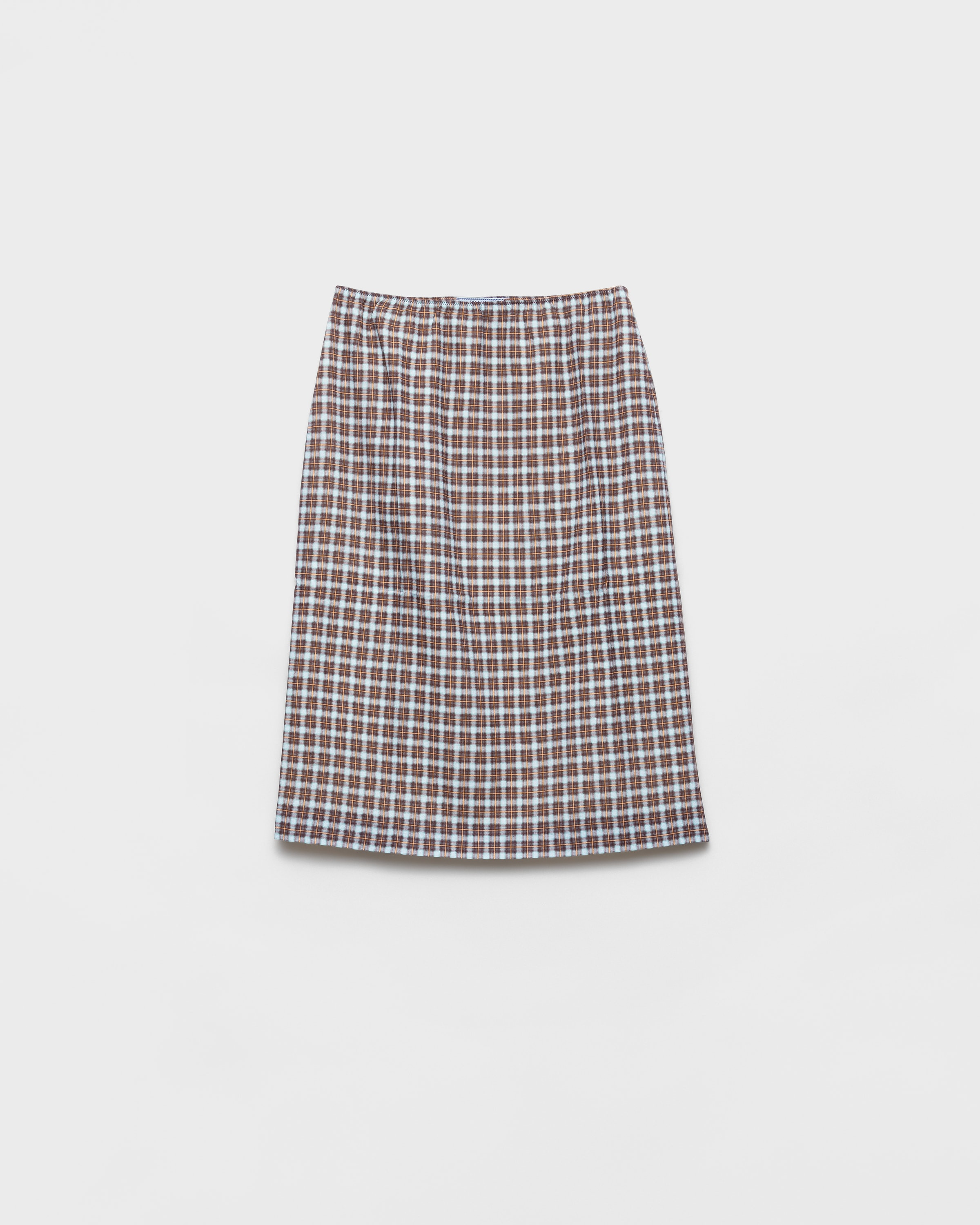 A check print with modernist style enriches this straight-cut georgette skirt. The tonal triangle logo adds its signature touch to the garment with casual elegance. - Product code: P179Y_173N_F0SV4_S_OOO - «Check» print - Pencil silhouette - Lined garment - Side snap and button closure - Fabric triangle logo - Imported - The model is 180 cm tall and wears a size 38 Height: 65cm MATERIALS Main material: 9% elastane 91% silk