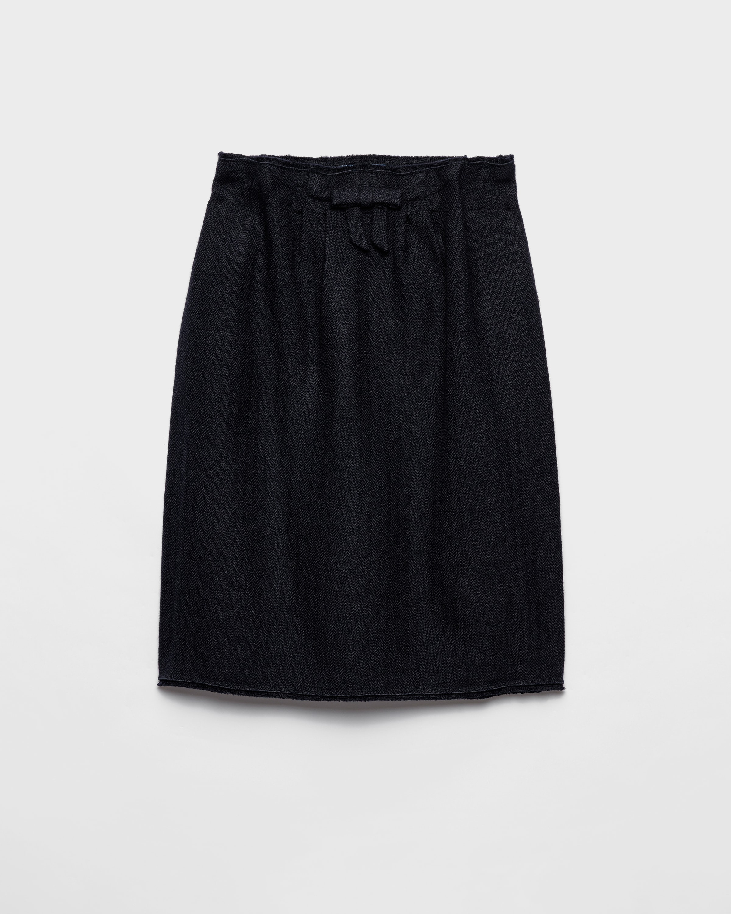 The Fall/Winter 2025 collection explores the perception of femininity and redefines its iconic pieces. This chevron wool skirt features a structured silhouette, enhanced by soft draping at the waist and adorned with a tone-on-tone bow. - Product code: P134ZG_18DE_F0008_S_OOO - Loose fit - Lined garment - Side closure with hook and zip - Side pockets - Front bow detail - Imported - The model is 180 cm tall and wears a size 38 Height: 67cm MATERIALS Main material: 100% virgin wool