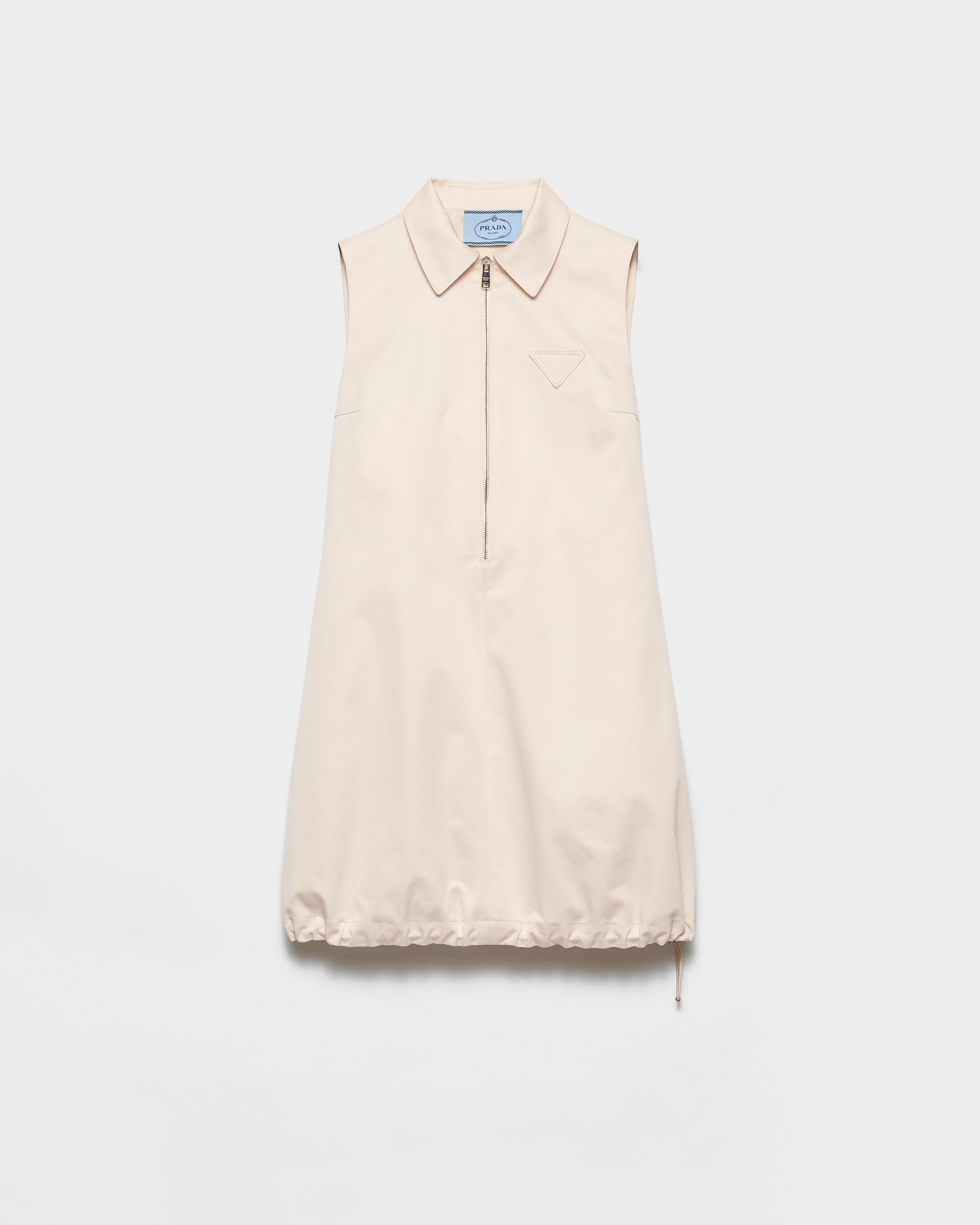 Clean lines and sleek details define this mini-dress with contemporary elegance. The minimalist silhouette plays with feminine elements and sporty touches, while the drawstring hem adds soft volume to the style. - Product code: P3Q81_10YP_F0018_S_OOO - Unlined - Shirt collar - Front zipper closure - Sleeveless - Inseam pockets - Fabric triangle logo - Flared hem - Drawstring hem - Imported - The model is 178 cm tall and wears a size 38 Height: 85cm MATERIALS Main material: 100% cotton