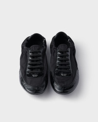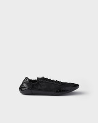 Collapse sneakers stand out for their incredibly light, deconstructed design with flat soles and elasticized sides. The design is made of leather and Re-Nylon, a combination of materials that embodies the sporty and artisanal soul of the style. - Product code: 1E959N_3ZMH_F0002_F_005 - Upper with leather inserts - Leather lining - Screen-printed Prada Milano logo - Flat laces - Rubber sole, 5 mm - Tread with geometric pattern - Removable leather-covered insole - Imported MATERIALS Main material: Recycled Polyamide Recycled Polyester