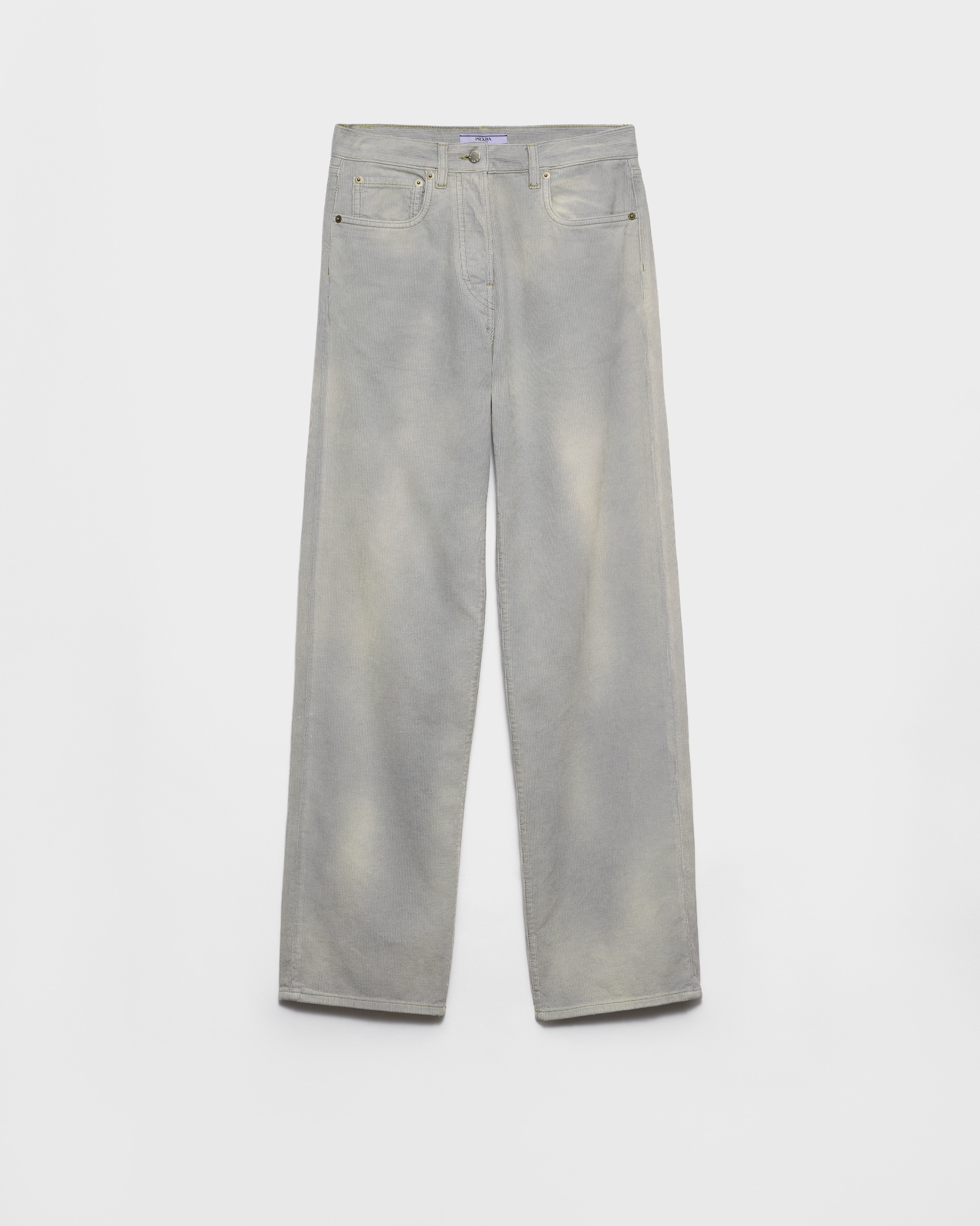 These low-rise jeans with a relaxed fit and innovative, hybrid design are made of narrow gauge corduroy with an effect that reproduces the textured of washed denim. The label enriched with an archive logo completes the versatile style. - Product code: GFP533_166E_F0V3N_S_OOO - Washed treatment - Relaxed fit - Low-rise waist - Hem width: 22.5 cm, Size: 25 - Button fly - Total length 107 cm, size: 25 - Prada Milano logo label on the back - Imported - The model is 176 cm tall and wears a size 38 Height: 107cm MATERIALS Main material: 100% cotton