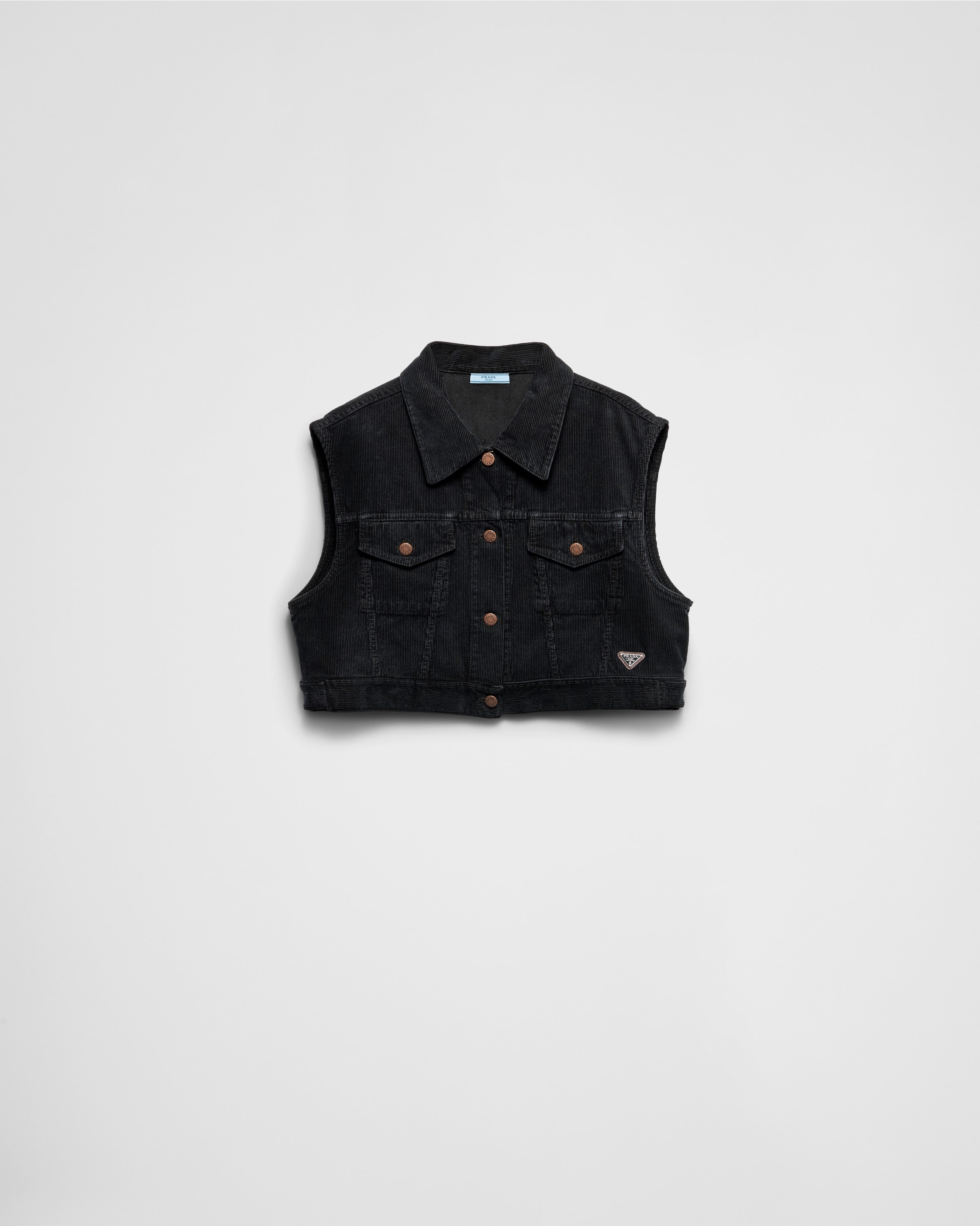 This corduroy vest stands out for its relaxed attitude and vintage-inspired details that enrich the boxy silhouette. - Product code: GFB312_1449_F0557_S_OOO - Garment-dyed treatment - Unlined garment - Loose fit - Classic collar - Button closure - Matching stitching - Flapped pockets with button on the chest - Center-back length: 42 cm, Size: XS - Straight hem with buttons for double adjustment on the back - Triangle logo - Strap with buckle on the back - Prada Milano logo label on the back - Imported - The model is 178 cm tall and wears a size 38 Height: 42cm MATERIALS Main material: 100% cotton