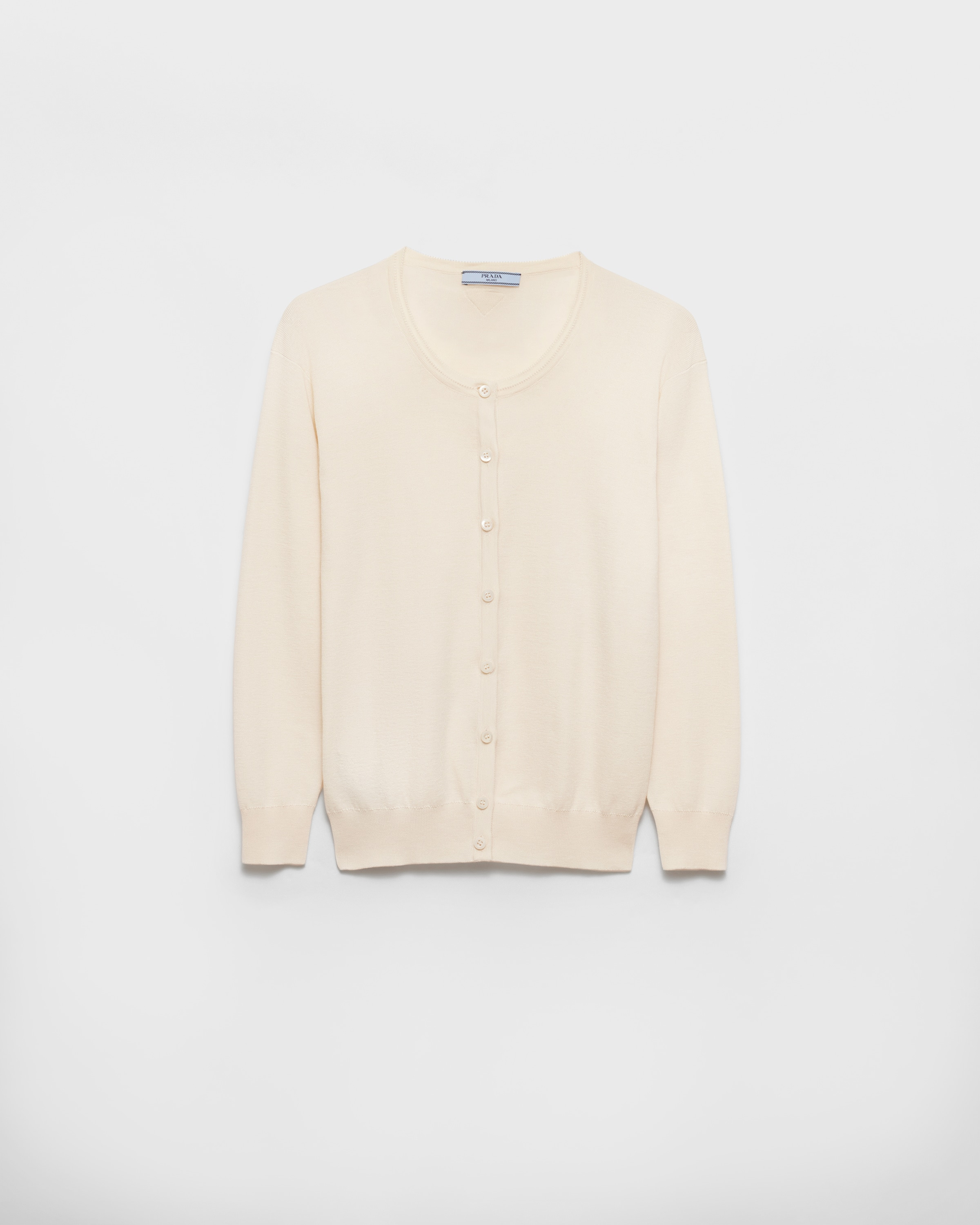 This light silk and cotton cardigan has a slim fit and three-quarter sleeves. Simple and versatile, it is distinguished by its button closure and the discreet knit triangle logo. - Product code: P25N65_17IN_F0018_S_OOO - Three-quarter sleeve - Plain knit - Slim-fit silhouette - Semi-raglan shoulder - Ribbed knit cuffs and hem - Knit triangle logo - Front button closure - Imported - The model is 181 cm tall and wears a size 38 Height: 62cm MATERIALS Main material: 38% cotton 62% silk