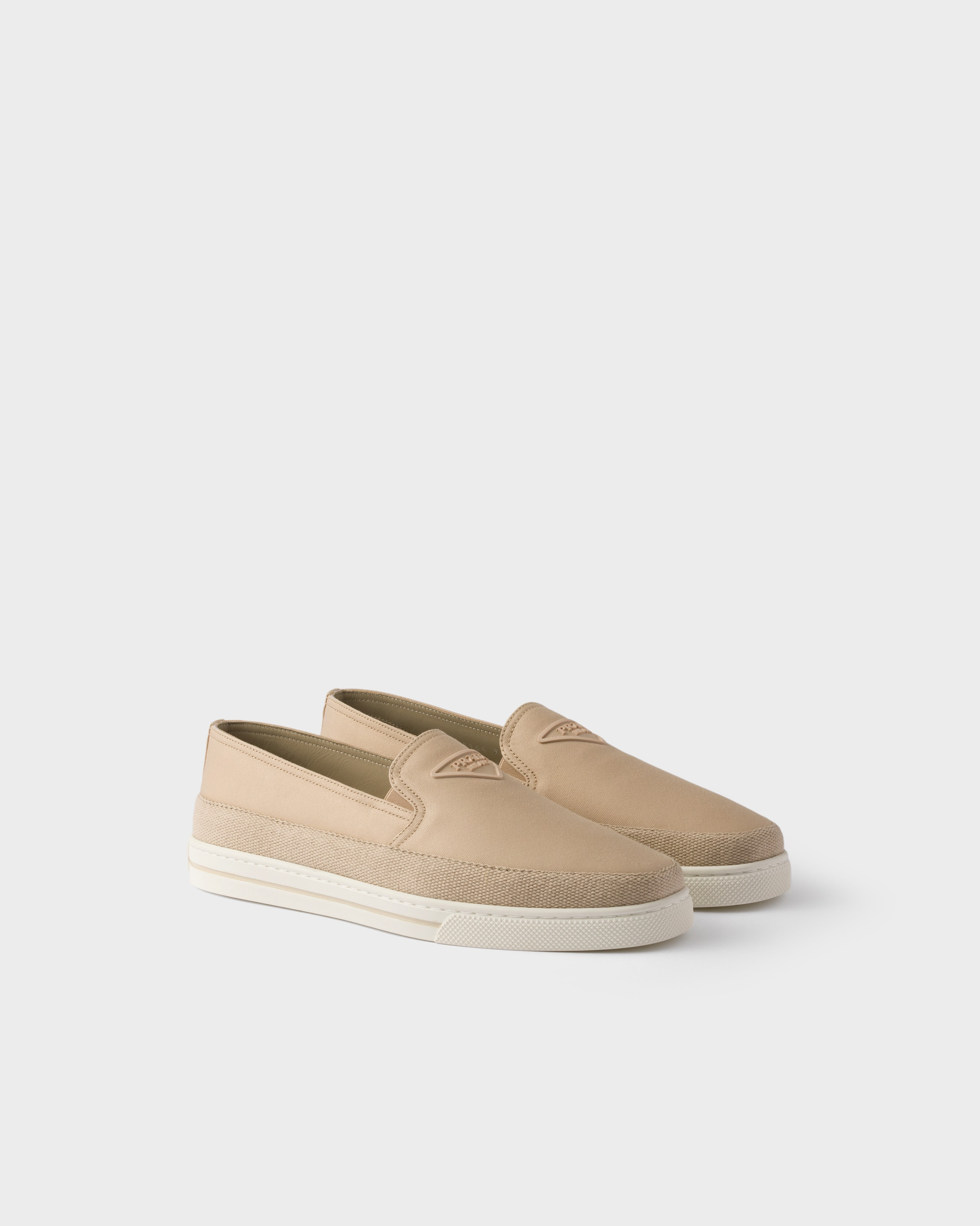 These lightweight and versatile slip-ons are made of cotton canvas with a design featuring sleek, contemporary lines. The rubber soles define the casual style of the shoes decorated with the embossed triangle logo. - Product code: 2S2964_3LKE_F0065_F_G000 - Upper with embossed rubber triangle logo - Lightweight expanded rubber sole with logo on the heel, 25 mm - Removable leather-covered insole - Imported MATERIALS Main material: Cotton