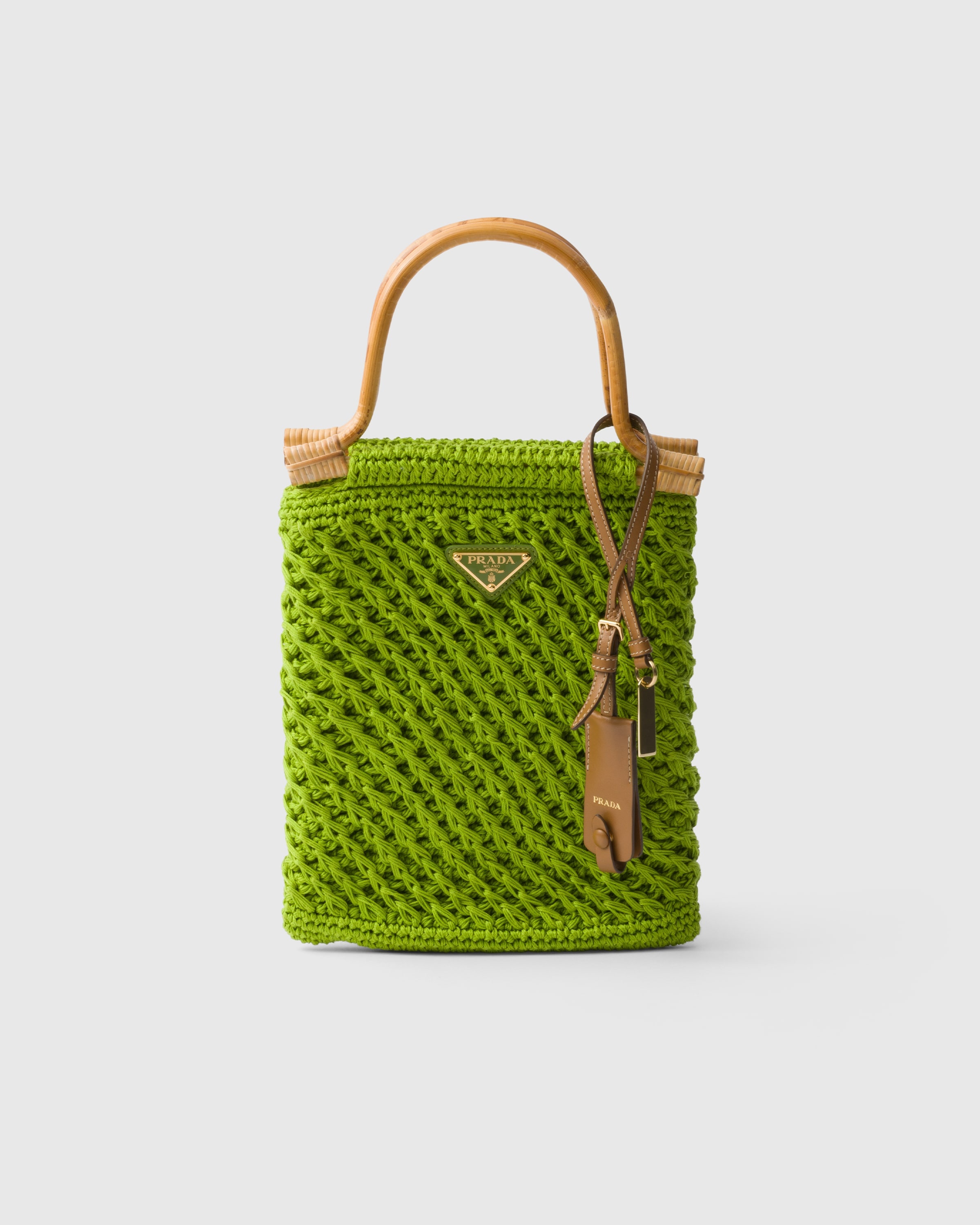 Contrasting materials, artisan workmanship and romantic touches come together: This crochet mini-bag is enhanced with a wooden handle and leather pendant. - Product code: 1BA461_2HG7_F0394_V_OOO - Wooden handles - Removable leather pendant - Metal hardware - Enameled metal triangle logo on the front - Nylon lining - Imported Height: 23cm Width: 21cm MATERIALS Main material: Cotton